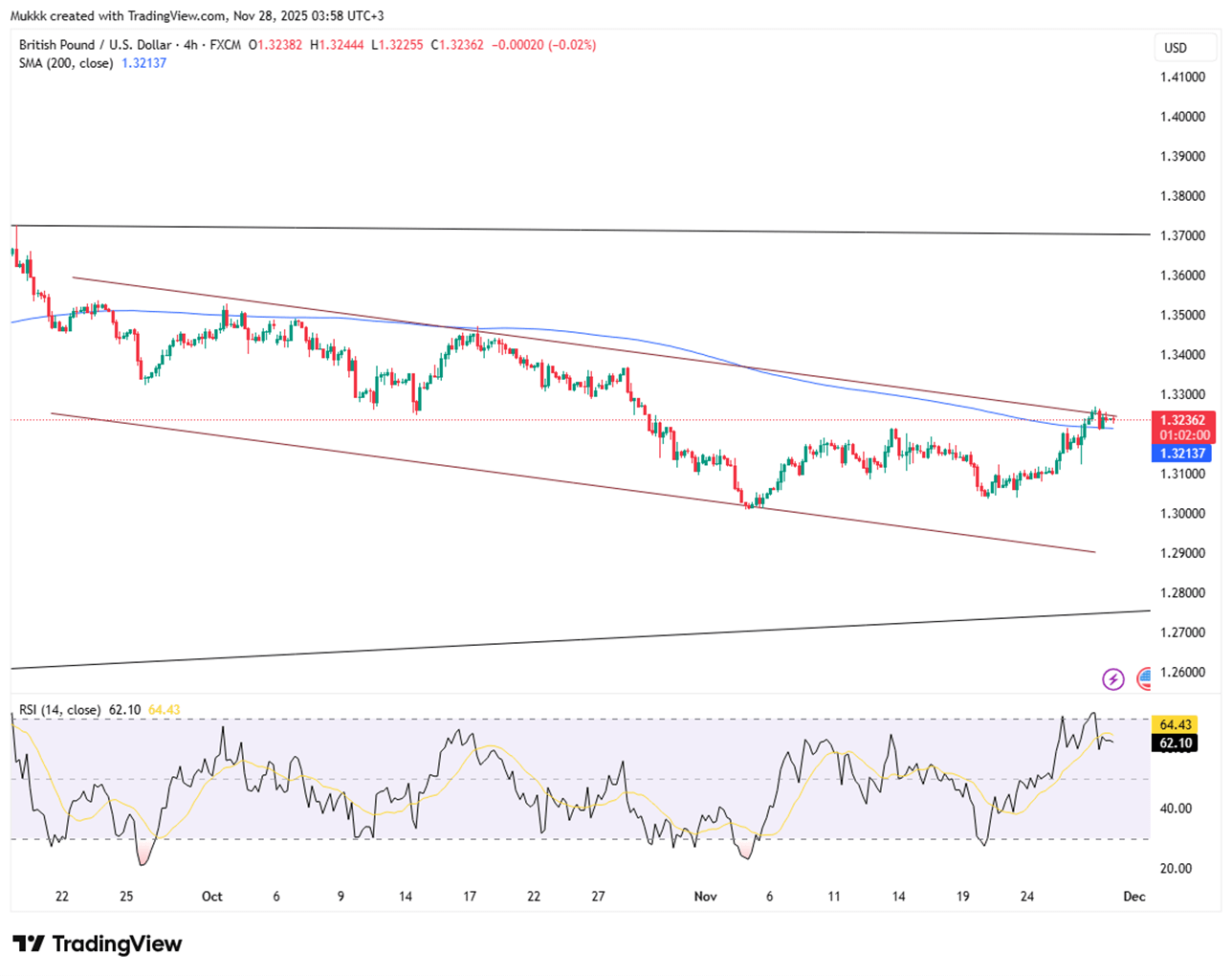 ارتفع زوج الجنيه الإسترليني/الدولار الأمريكي إلى حوالي 1.3240 في آسيا، مواصلاً سلسلة مكاسبه لسبع جلسات متتالية، حيث أثرت التوقعات المتزايدة بخفض أسعار الفائدة من قبل بنك الاحتياطي الفيدرالي على الدولار. تقدر الأسواق الآن احتمالية خفض أسعار الفائدة بمقدار 25 نقطة أساس في ديسمبر بنسبة 87٪، مع احتمال المزيد من التسهيلات النقدية إذا أصبح كيفن هاسيت رئيساً لبنك الاحتياطي الفيدرالي. كما وجد الجنيه الإسترليني دعماً من الثقة المتجددة في ميزانية وزيرة المالية راشيل ريفز. في حين أشارت التوقعات الأولية لمكتب المسؤولية المالية (OBR) إلى نمو أضعف، ساعدت زيادة الاحتياطي المالي القوي البالغ 22 مليار جنيه إسترليني وتحسن المالية العامة في رفع المعنويات.
