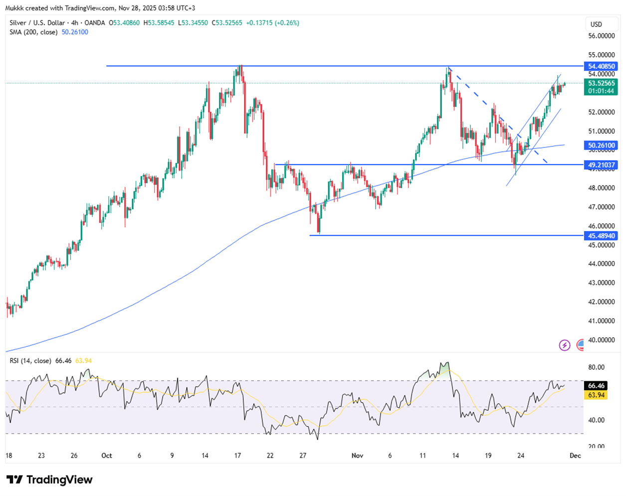 تراجعت الفضة من منطقة 54.40 دولارًا إلى 54.45 دولارًا، وهو أقوى مستوى لها منذ 17 أكتوبر، وتراجعت إلى منتصف نطاق 53 دولارًا في جلسة الجمعة الآسيوية. على الرغم من التراجع، لا يزال زوج XAG/USD مرتفعًا بنحو 0.20٪ خلال اليوم ويظل مستعدًا لتحقيق تقدم أسبوعي قوي.