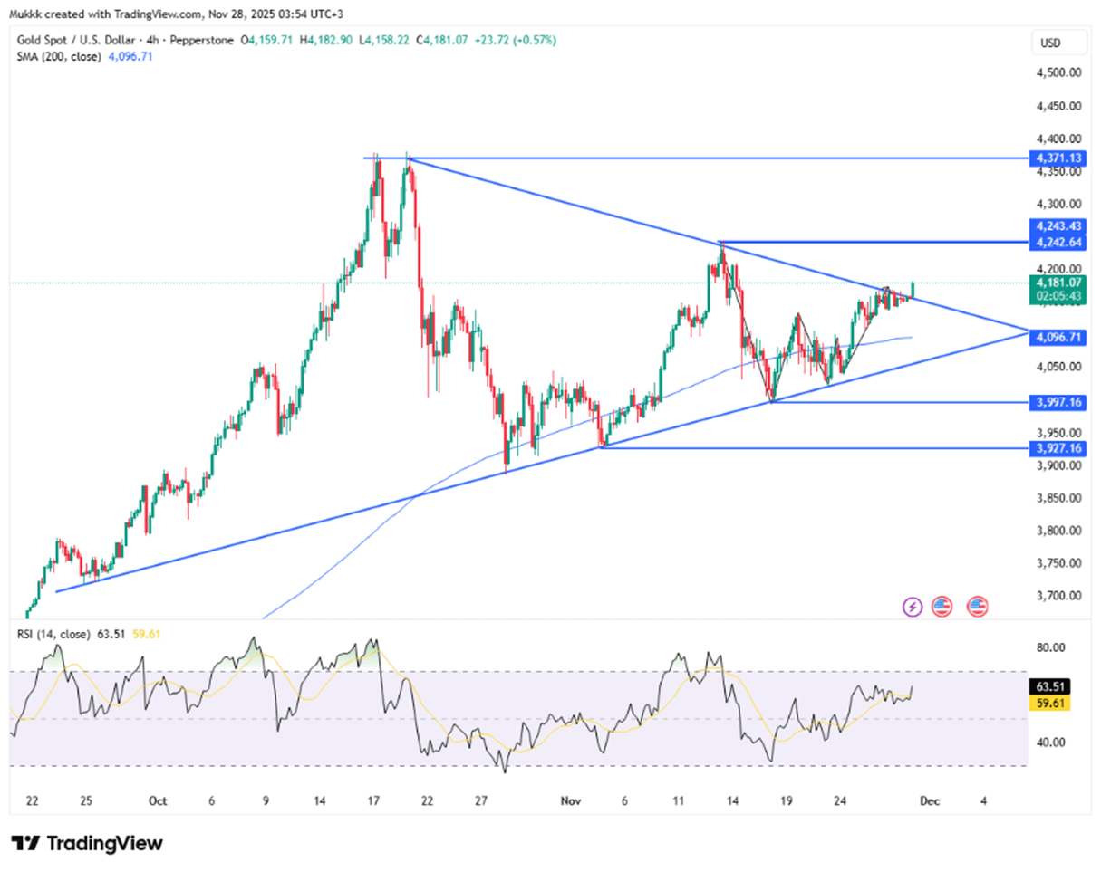 من الناحية الفنية، يوجد الدعم بالقرب من 4100 دولار، بينما تقع المقاومة حول 4200 دولار.