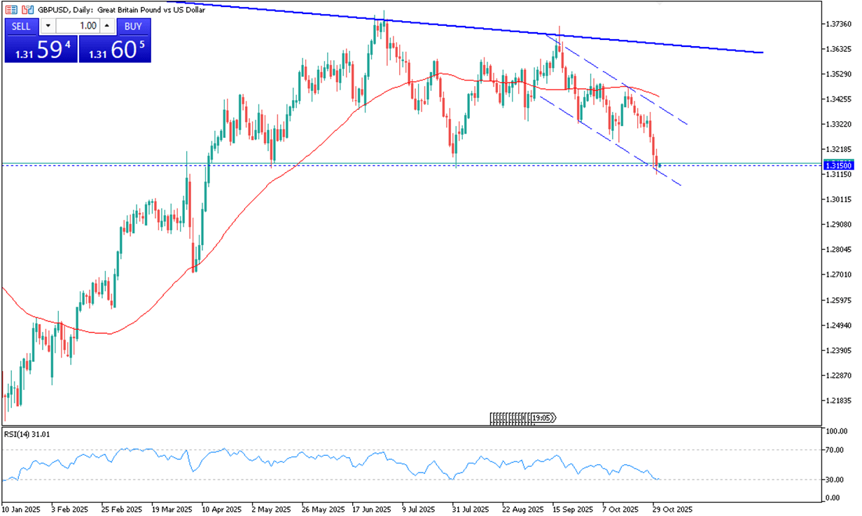 انخفض الجنيه الإسترليني إلى ما دون 1.32 دولار، وهو أدنى مستوى له منذ أبريل، مع ارتفاع الدولار الأمريكي بعد خفض سعر الفائدة بواقع 25 نقطة أساس كما كان متوقعاً من قبل بنك الاحتياطي الفيدرالي. وأبقت تعليقات رئيس البنك الاحتياطي الفيدرالي جيروم باول بأن خفضاً آخر هذا العام غير مؤكد على قوة الدولار. كما واجه الجنيه الإسترليني ضغوطاً من تزايد التوقعات بخفض سعر الفائدة من قبل بنك إنجلترا والمخاوف من أن الميزانية لشهر نوفمبر قد تثقل كاهل النمو.