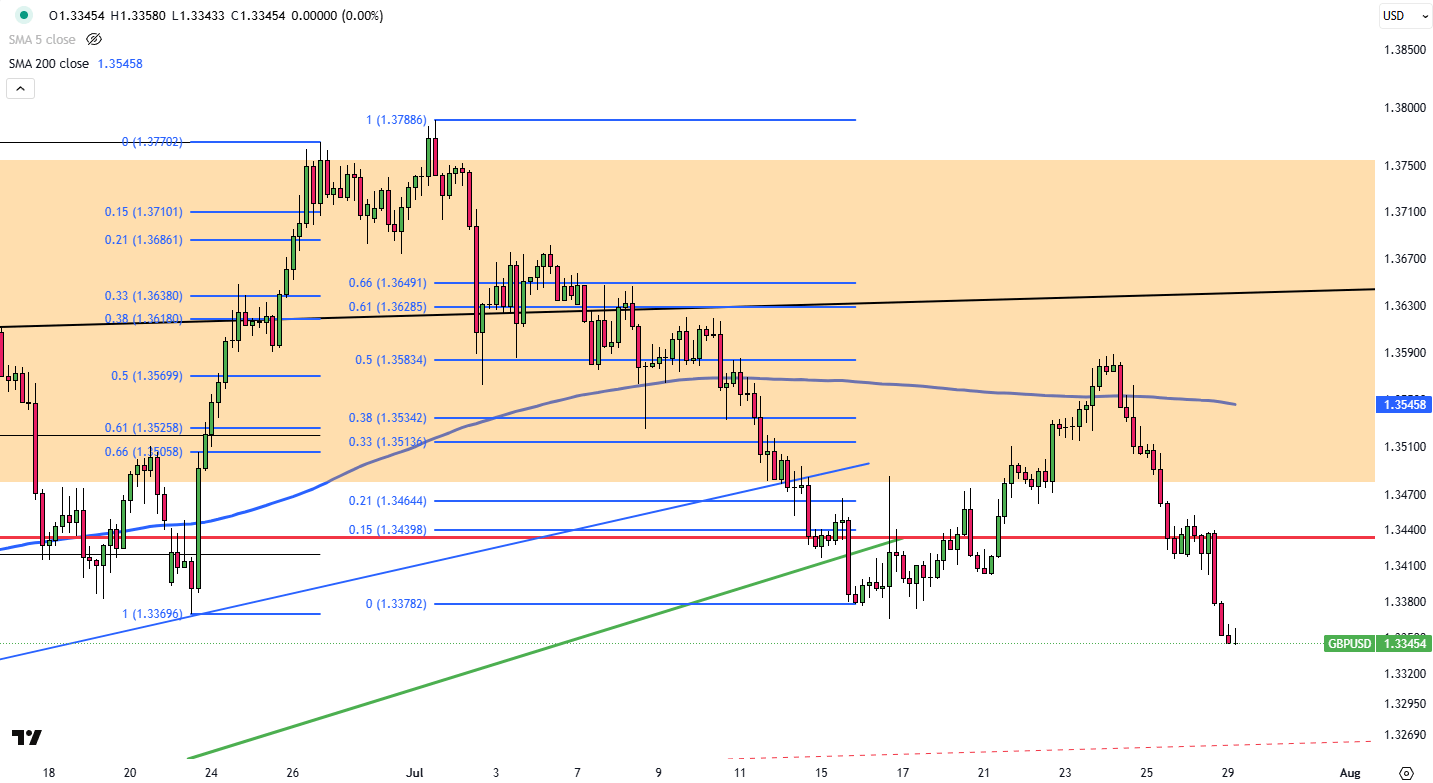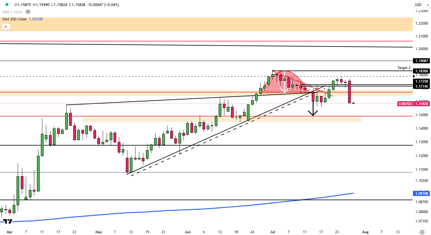 ارتفع اليورو لفترة وجيزة إلى 1.176 دولار ولكنه انخفض لاحقًا بنسبة 1.3% تقريبًا ليصل إلى 1.1590 دولار، وهو أدنى مستوى له في أسبوع، حيث ارتفع الدولار بعد الاتفاق التجاري الجديد بين الولايات المتحدة والاتحاد الأوروبي. ويشمل الاتفاق فرض تعريفة جمركية بنسبة 15% على الصادرات الأوروبية، بعد أن كانت 30%. كما سيتم إعفاء بعض السلع مثل قطع غيار الطائرات وبعض المواد الكيميائية، كما سيتم تخفيض الرسوم الجمركية على السيارات إلى 15%. كما تعهد الاتحاد الأوروبي أيضًا بشراء المزيد من الطاقة الأمريكية ودعم الاستثمار. وفي حين يُنظر إلى الاتفاق على أنه يخفف من حدة التوترات التجارية، إلا أن الأسواق كانت تتوقعه إلى حد كبير. وفي أوروبا، يرى الكثيرون أن الاتفاق من جانب واحد. يتحول الاهتمام الآن إلى قرار سياسة الاحتياطي الفيدرالي هذا الأسبوع.