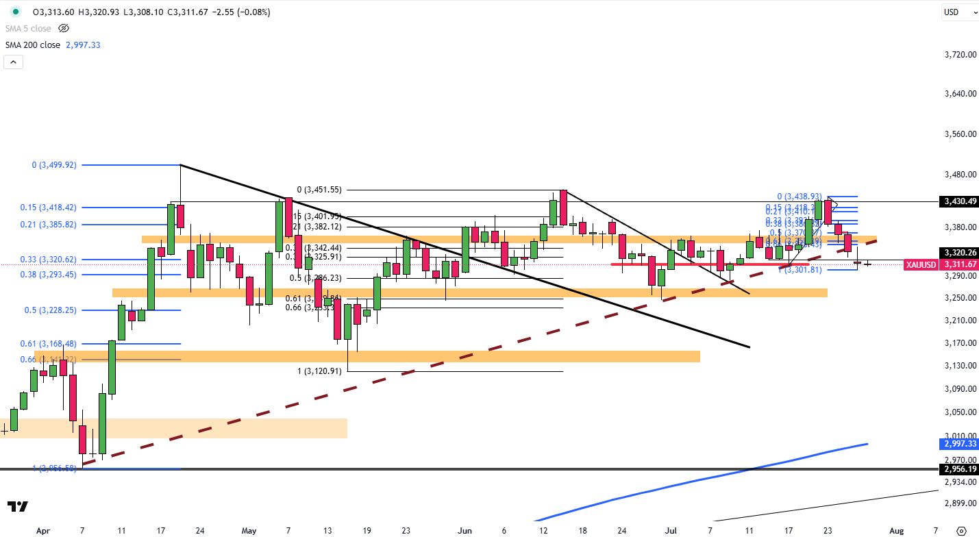 ارتفع الذهب إلى حوالي 3,310 دولار للأونصة يوم الثلاثاء، لكنه ظل بالقرب من أدنى مستوى له في ثلاثة أسابيع، حيث أدى تراجع حدة التوترات التجارية إلى تقليص الطلب على الملاذ الآمن. وتترقب الأسواق المحادثات بين الولايات المتحدة والصين، مع وجود آمال بتمديد فترة الـ 90 يومًا التي تم تمديدها إلى فترة وقف التعريفة الجمركية في 12 أغسطس. ويأتي ذلك في أعقاب اتفاق التعريفة الجمركية الذي تم التوصل إليه يوم الأحد مع الاتحاد الأوروبي بنسبة 15%، بينما تستمر المحادثات مع كندا وكوريا الجنوبية. ومن المتوقع أن يُبقي الاحتياطي الفدرالي على أسعار الفائدة ثابتة هذا الأسبوع، على الرغم من أن خفضها في سبتمبر/أيلول لا يزال مطروحًا على الطاولة.