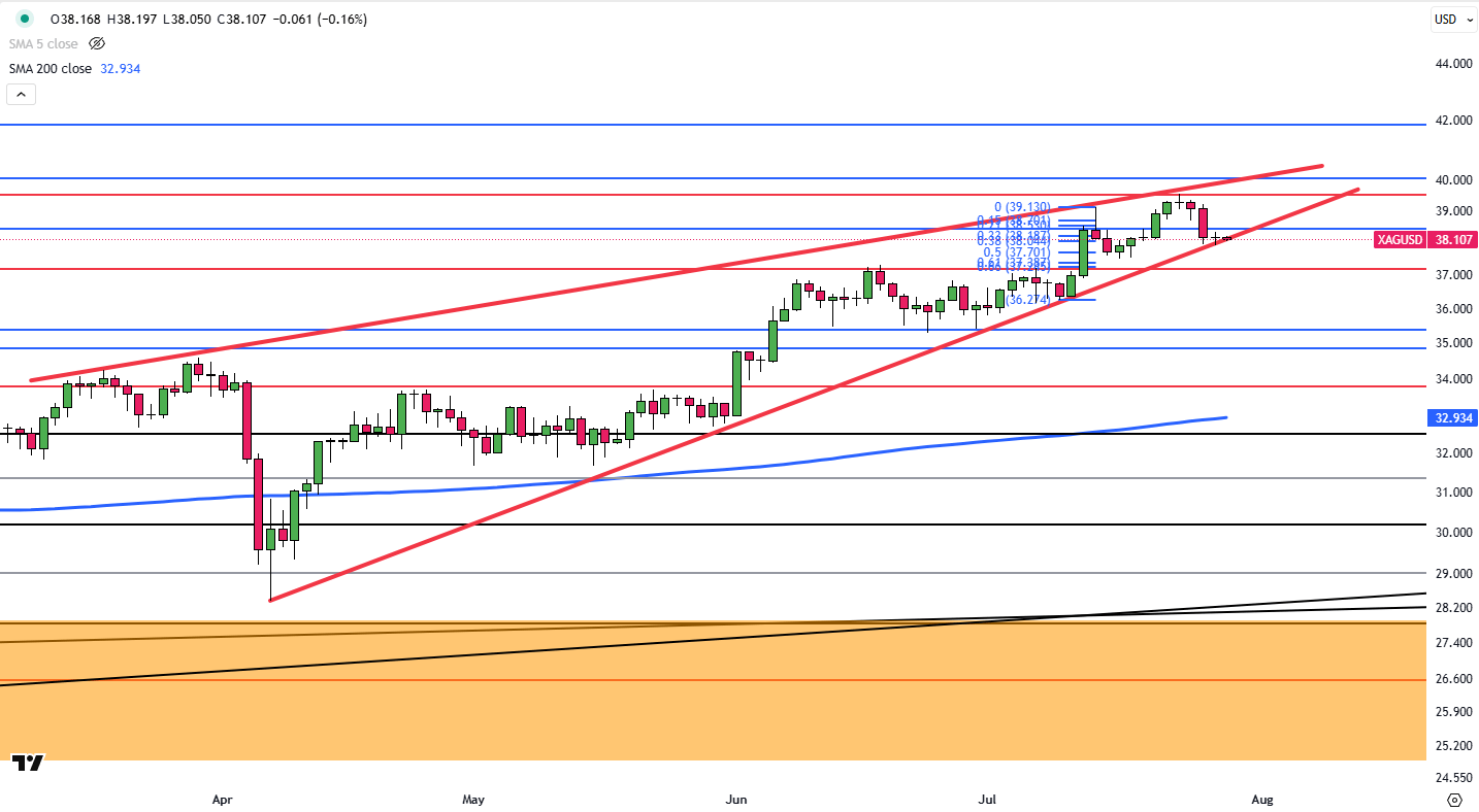 تراجعت الفضة بنسبة 0.2% إلى 38.10 دولار للأونصة يوم الثلاثاء، مقتديةً بالذهب الذي شهد تراجعًا في ظل تراجع حدة التوترات التجارية وقوة الدولار الأمريكي مما قلل من الطلب على الملاذ الآمن. وجاء هذا الانخفاض وسط تقدم في المحادثات الأمريكية الصينية واتفاق جديد بين الولايات المتحدة والاتحاد الأوروبي بشأن الرسوم الجمركية. ومع اقتراب الدولار من أعلى مستوى له في أسبوع واحد، أصبحت الفضة أكثر ارتفاعًا بالنسبة للمشترين الأجانب. وتنتظر الأسواق الآن البيانات الأمريكية الرئيسية وقرار مجلس الاحتياطي الفيدرالي بشأن السياسة النقدية لمزيد من التوجيه.