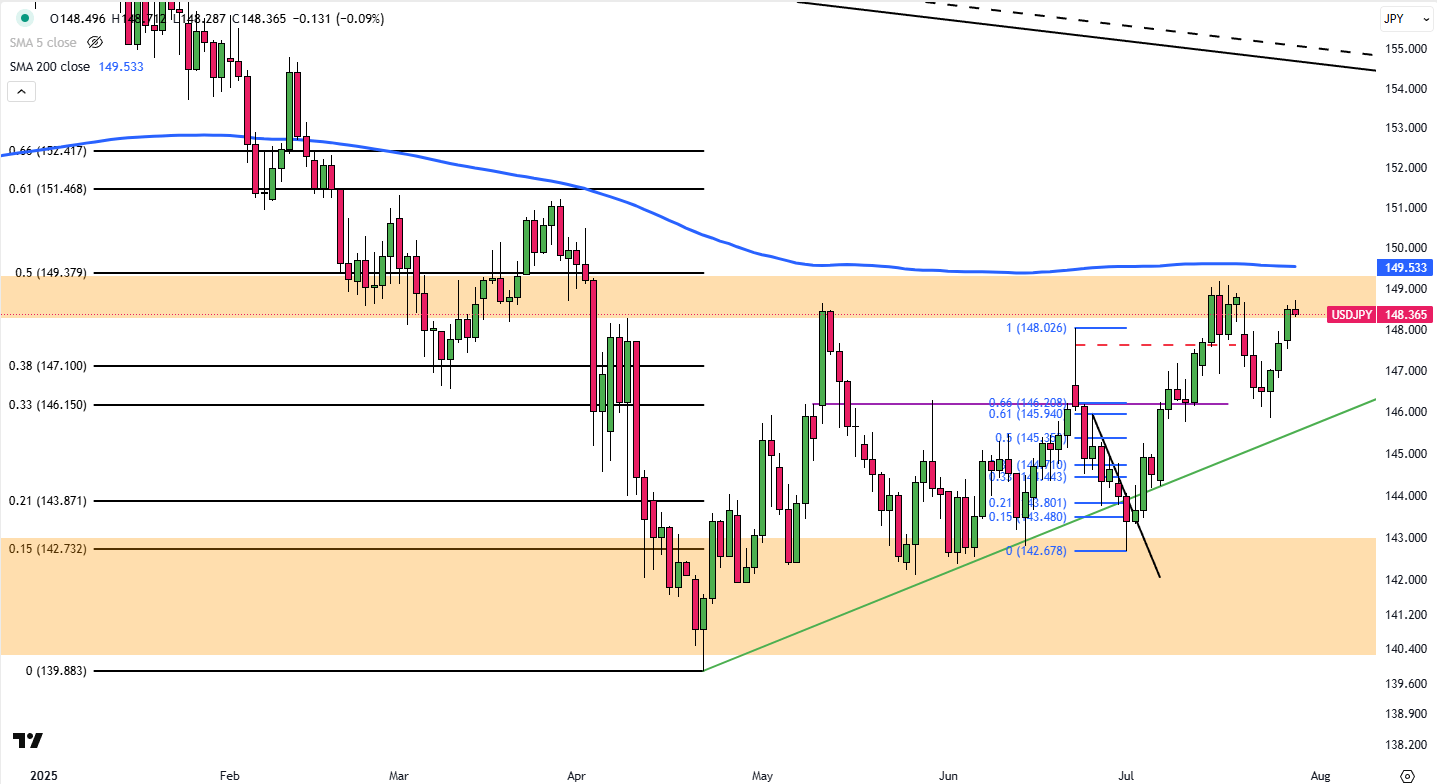 استقر الين حول 148.3 للدولار يوم الثلاثاء، بالقرب من أدنى مستوياته في أسبوع، بعد ثلاثة أيام متتالية من الخسائر بسبب المكاسب الواسعة للدولار والاتفاقات التجارية التي تميل إلى الولايات المتحدة. وحذر الرئيس ترامب من أن الدول التي تتجنب الصفقات الثنائية قد تواجه رسومًا جمركية تتراوح بين 15 و20%. في اليابان، من المتوقع أن يُبقي بنك اليابان على أسعار الفائدة دون تغيير هذا الأسبوع، على الرغم من أنه من المحتمل أن يقوم البنك بمراجعة توقعات التضخم بالزيادة. وفي الوقت نفسه، يتعرض رئيس الوزراء الياباني” إيشيبا“لضغوط من أجل الاستقالة ولكنه لا يزال ثابتًا في منصبه.