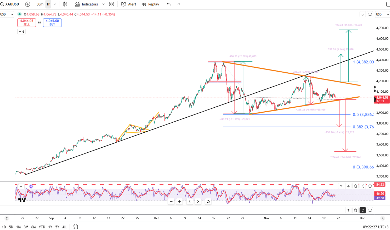انخفض سعر الذهب إلى حوالي 4060 دولارًا يوم الجمعة، ومن المتوقع أن يسجل خسارة أسبوعية طفيفة مع تراجع التوقعات بخفض سعر الفائدة من قبل بنك الاحتياطي الفيدرالي في ديسمبر بعد تأجيل تقرير الوظائف. ارتفع عدد الوظائف في سبتمبر بمقدار 119,000 وظيفة، متجاوزًا التوقعات، في حين ارتفعت نسبة البطالة إلى 4.4٪ ونمت الأجور بنسبة 3.8٪، مما يشير إلى تباطؤ سوق العمل ولكنه مستقر. مع إدراج بيانات أكتوبر في نوفمبر وحث مسؤولي بنك الاحتياطي الفيدرالي على توخي الحذر، انخفضت احتمالية خفض أسعار الفائدة في ديسمبر إلى حوالي 40٪.