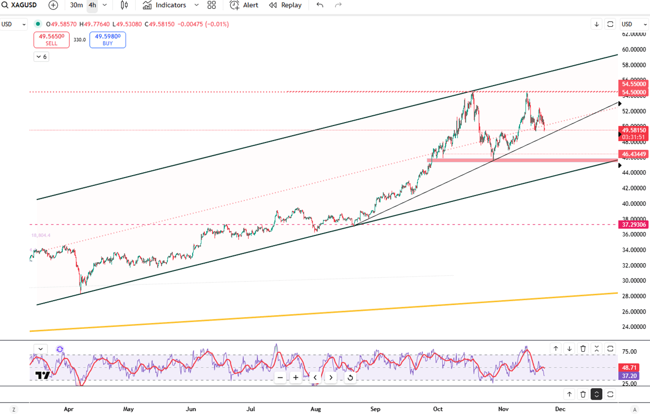 انخفضت الفضة إلى ما دون 50 دولارًا يوم الجمعة، مواصلة انخفاضها للجلسة الثانية على التوالي، حيث خفض المتداولون توقعاتهم بخصوص خفض سعر الفائدة من قبل بنك الاحتياطي الفيدرالي في ديسمبر. أظهر تقرير الوظائف غير الزراعية المتأخر ارتفاعًا في معدل التوظيف في سبتمبر، لكن معدل البطالة ارتفع إلى 4.4٪، وهو أعلى معدل في أربع سنوات. مع تخطي تقرير أكتوبر، فإن هذا هو آخر تحديث للعمالة قبل اجتماع اللجنة الفيدرالية للسوق المفتوحة. كما دعا محافظ بنك الاحتياطي الفيدرالي بار إلى توخي الحذر بشأن التسهيلات الإضافية بسبب استمرار التضخم. ومن المتوقع أن تنهي الفضة الأسبوع بانخفاض أكثر من 1٪.