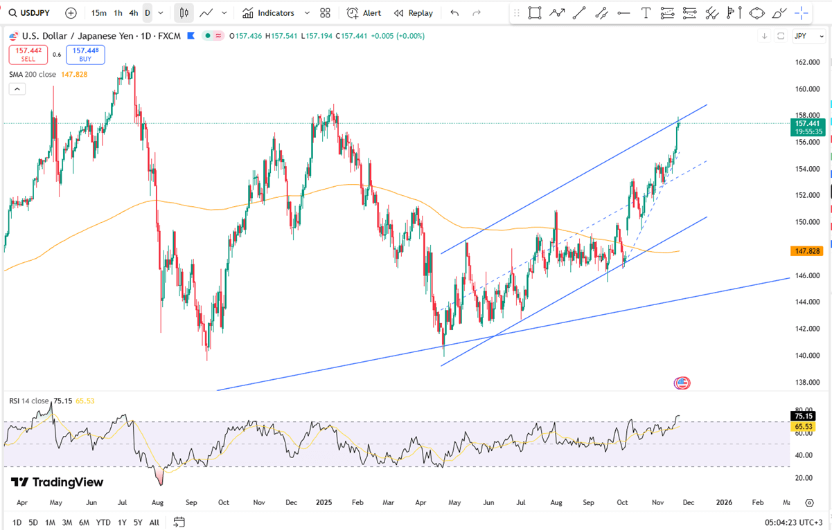 شهد الين الياباني انتعاشًا متواضعًا يوم الجمعة، مدعومًا بضعف الأسهم والتكهنات بأن السلطات قد تتحرك للحد من المزيد من الانخفاضات في العملة بعد تصريحات وزير المالية ساتسوكي كاتاياما. ومع ذلك، لا يزال ارتفاعه مقيدًا حيث أن موافقة اليابان على حزمة تحفيز بقيمة 21.3 تريليون ين ياباني تزيد من المخاوف المالية وتزايد التوقعات بأن بنك اليابان سيؤجل رفع أسعار الفائدة. في هذه الأثناء، يحوم الدولار الأمريكي بالقرب من أعلى مستوياته في أواخر مايو/أيار وسط تلاشي رهانات خفض الاحتياطي الفيدرالي لأسعار الفائدة، مما يحافظ على دعم الدولار الأمريكي/الين الياباني.