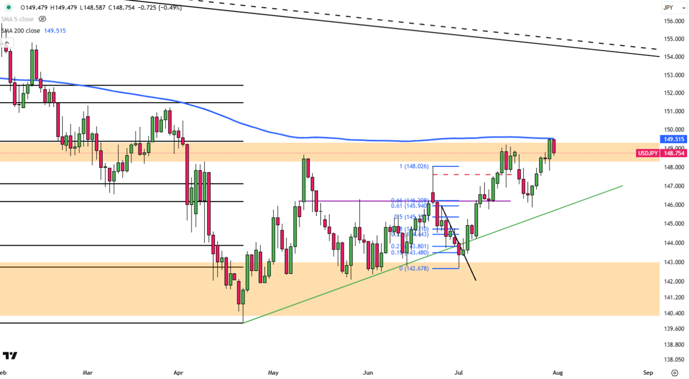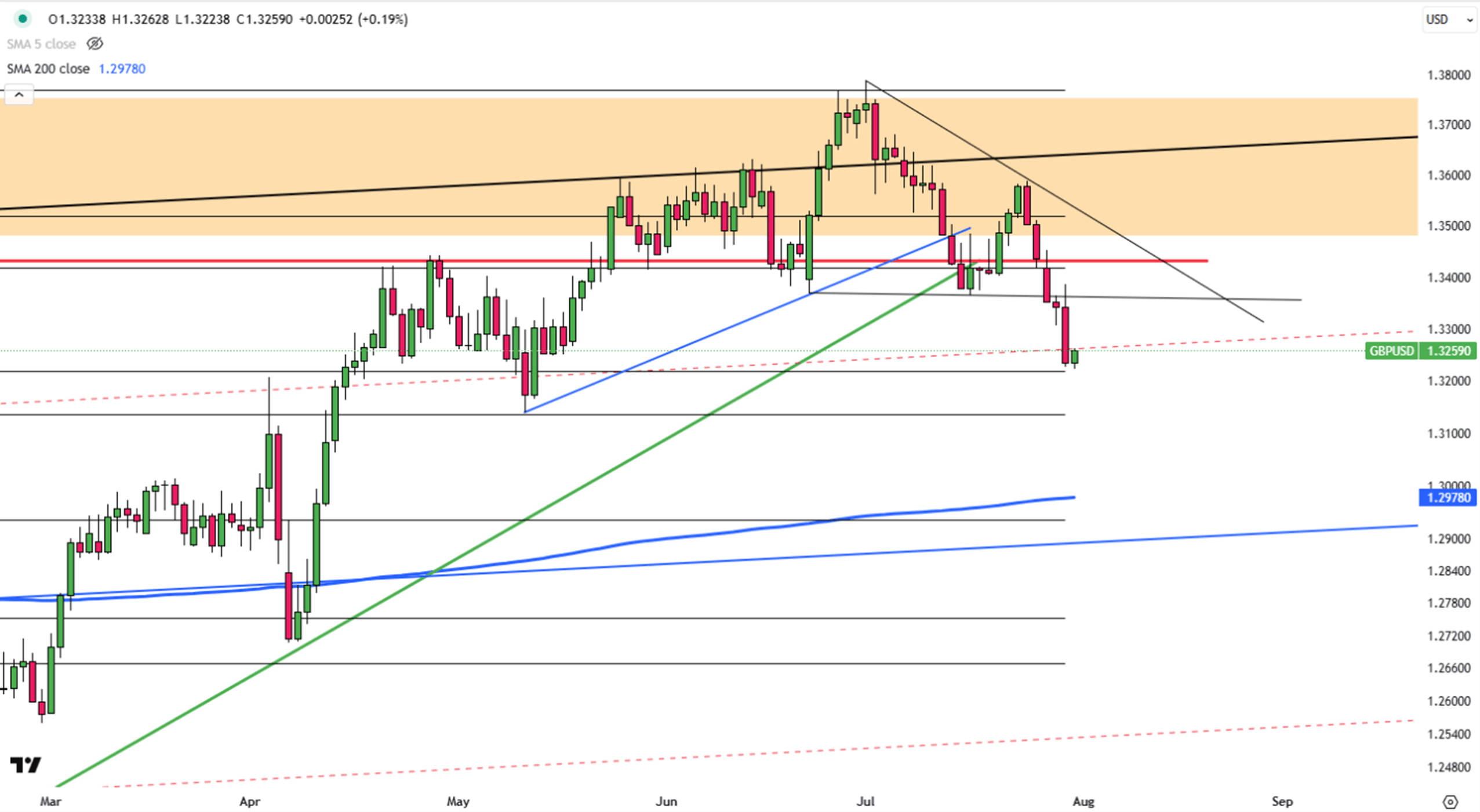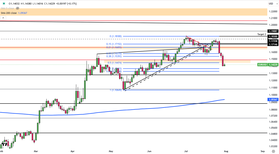 انخفض اليورو إلى 1.14 دولار، وهو أدنى مستوى له منذ منتصف يونيو، حيث اكتسب الدولار قوة في أعقاب قرار الاحتياطي الفيدرالي بالإبقاء على أسعار الفائدة دون تغيير وعدم تقديم أي إشارة واضحة لشهر سبتمبر، مما قلل من الآمال في خفض الفائدة على المدى القريب. نما الناتج المحلي الإجمالي في منطقة اليورو في الربع الثاني بنسبة 0.1%، متباطئًا من 0.6% في الربع الأول ولكنه فاق التوقعات. أظهرت الأرقام الوطنية المتباينة انكماشًا في ألمانيا وإيطاليا، في حين توسعت فرنسا وإسبانيا. وفي الوقت نفسه، لا تزال المخاوف مستمرة بشأن صفقة تجارية تميل إلى الولايات المتحدة وتغير توقعات خفض أسعار الفائدة لدى البنك المركزي الأوروبي، حيث تقوم الأسواق بتسعير فرصة بنسبة 90% لخفض الفائدة بحلول مارس 2026 و30% فقط بحلول ديسمبر.