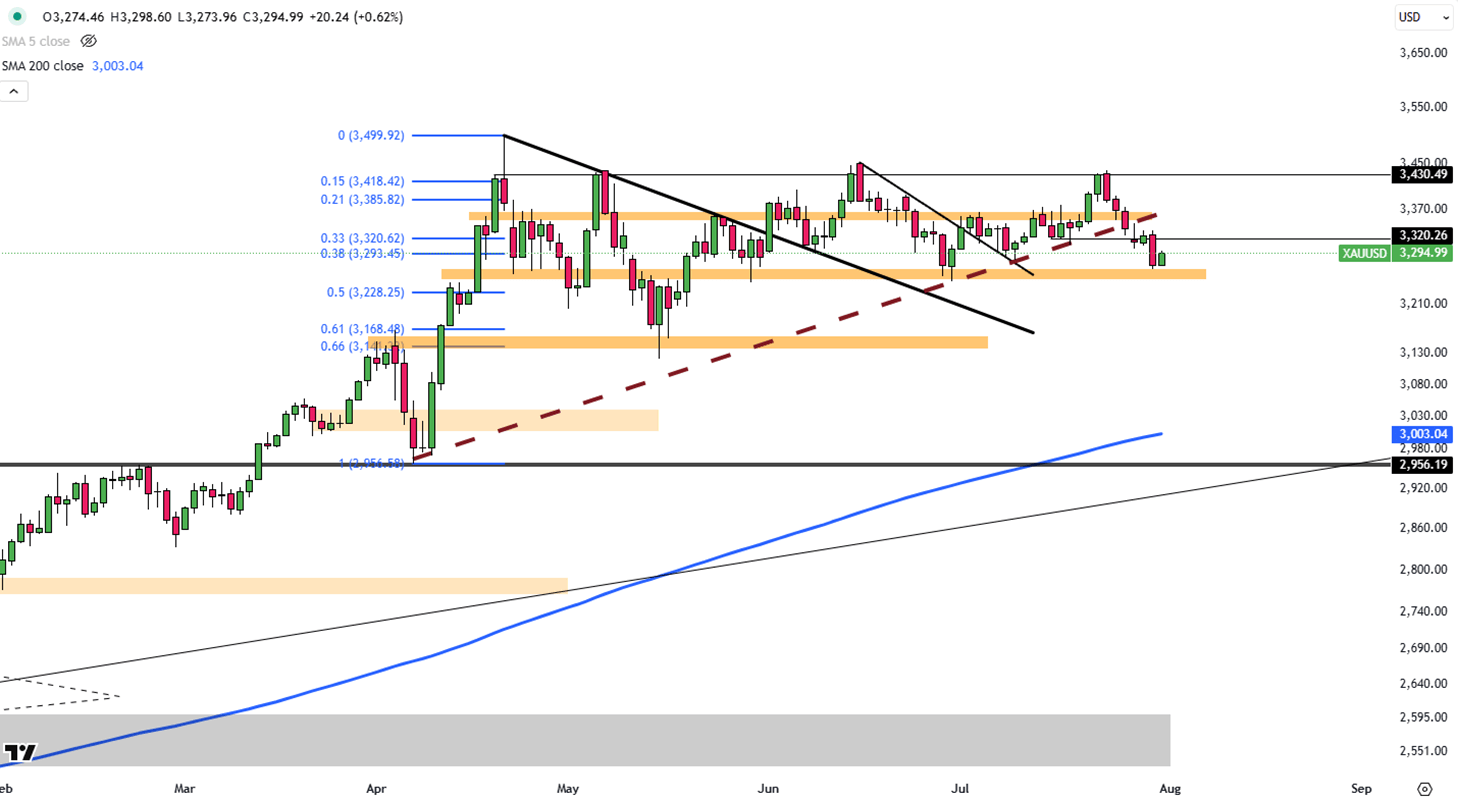 ارتفع الذهب فوق مستوى 3,290 دولار للأونصة يوم الخميس، منتعشًا من أدنى مستوى له في أربعة أسابيع، حيث قام المستثمرون بتقييم الإجراءات التجارية الأمريكية الأخيرة وإشارات السياسة الفيدرالية الأخيرة. وفرض الرئيس ترامب تعريفات جمركية جديدة، بما في ذلك فرض رسوم جمركية بنسبة 15% على السلع الكورية الجنوبية و25% على الواردات من الهند، مع إنهاء الإعفاءات للشحنات منخفضة القيمة. وقد أبقى بنك الاحتياطي الفيدرالي على أسعار الفائدة دون تغيير، وصرح رئيس مجلس الإدارة باول بأنه من السابق لأوانه التفكير في خفضها. تشير توقعات السوق الآن إلى أن توقعات السوق تشير إلى 35 نقطة أساس للتيسير بحلول نهاية العام. أثرت أرقام الناتج المحلي الإجمالي والتوظيف القوية في الولايات المتحدة على المعنويات، مع تحول التركيز إلى تضخم نفقات الاستهلاك الشخصي وبيانات الوظائف لشهر يوليو.