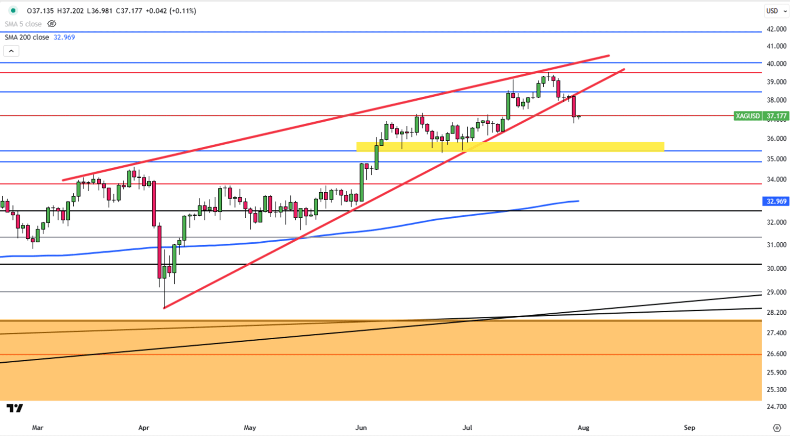 انخفضت الفضة إلى ما دون 37.5 دولار للأونصة يوم الخميس، مقتربة من أدنى مستوى لها في ثلاثة أسابيع بعد أن أبقى الاحتياطي الفيدرالي أسعار الفائدة عند 4.25%-4.5% في تصويت 9-2. ضغط المعارضون بومان ووالر من أجل خفض أسعار الفائدة وسط تراجع التضخم وضعف سوق العمل، وهو ما يمثل أول معارضة مزدوجة منذ عام 1993. وبينما كانت النتيجة متوقعة، تحول الاهتمام إلى خفض محتمل في سبتمبر. كرر ترامب دعواته لتخفيضات أعمق، حتى مع تفوق الناتج المحلي الإجمالي للربع الثاني على التوقعات بنمو بنسبة 3%.