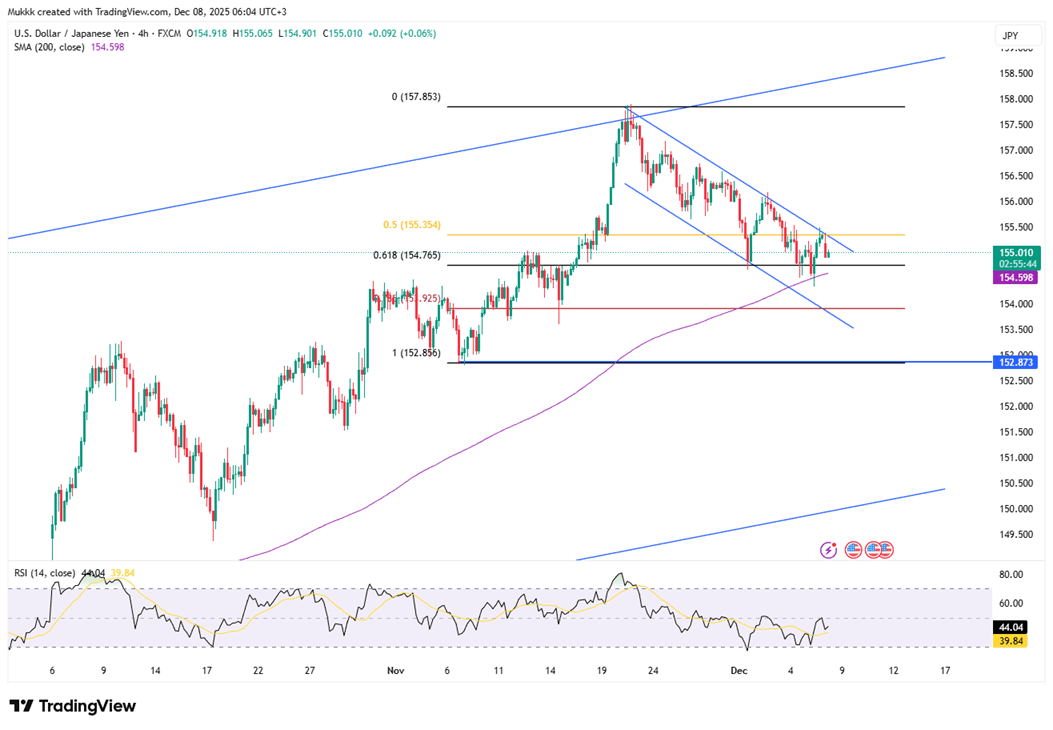 من الناحية الفنية، تقع المقاومة بالقرب من 155.50، بينما يقع الدعم حول 154.40.