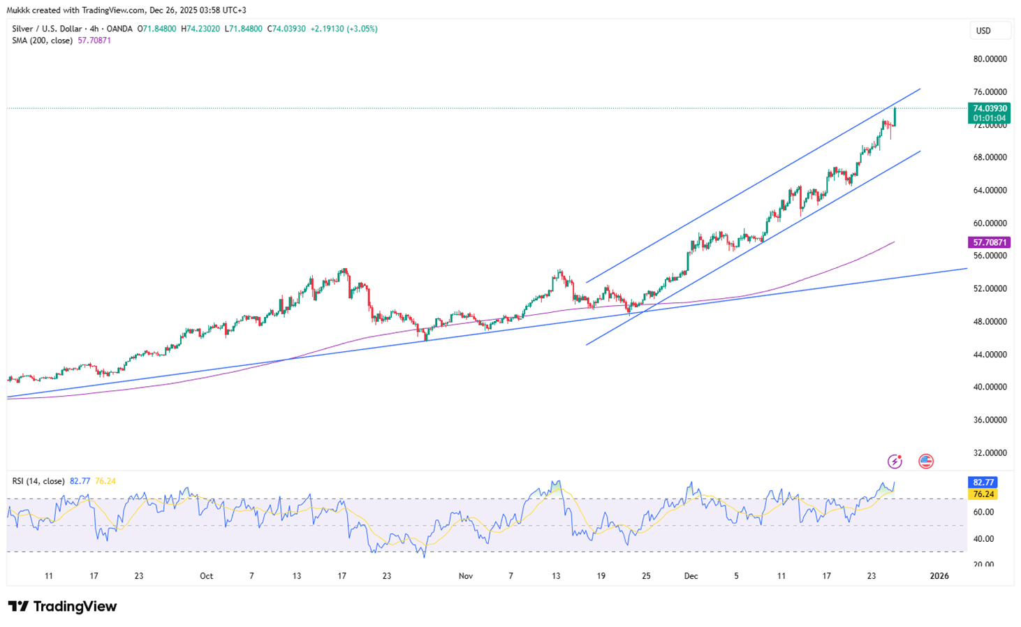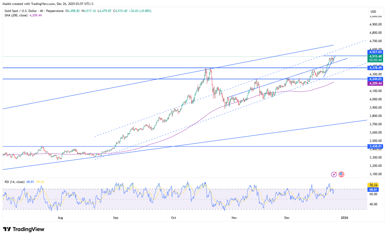 تداول الذهب بالقرب من 4500 دولار للأونصة بعد أن وصل إلى ذروة قياسية بلغت 4530 دولارًا، مدفوعًا بالصراعات الجيوسياسية والتخفيضات المتوقعة في أسعار الفائدة الأمريكية. يراقب المشاركون في السوق عن كثب الحصار المفروض على فنزويلا، والحرب بين روسيا وأوكرانيا، والعمليات العسكرية الأمريكية في نيجيريا. يتوقع المستثمرون أن يقوم الاحتياطي الفيدرالي بخفض أسعار الفائدة بمقدار 25 نقطة أساس العام المقبل مع تراجع بيانات التضخم والعمالة. بزيادة تزيد عن 70٪ في عام 2025، يشهد الذهب أفضل عام له منذ عام 1979، مدعومًا بتراكم كبير من البنك المركزي والطلب المستمر على صناديق الاستثمار المتداولة.
