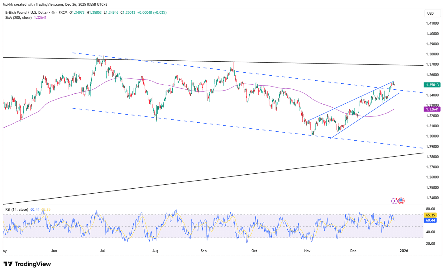 ارتفع الجنيه الإسترليني فوق 1.35 دولار، مسجلاً أعلى مستوى له في ثلاثة أشهر، حيث يتوقع المستثمرون قيام مجلس الاحتياطي الفيدرالي بخفض أسعار الفائدة مرتين على الأقل العام المقبل. وخفض بنك إنجلترا أسعار الفائدة بشكل طفيف إلى 3.75% في ديسمبر، مشيراً إلى مخاوف مستمرة بشأن التضخم. وعلى الرغم من تراجع التضخم إلى 3.2%، إلا أنه لا يزال أعلى بكثير من المستوى المستهدف. ارتفع الجنيه الإسترليني بأكثر من 2٪ هذا الشهر وحوالي 8٪ لعام 2025، وهو في طريقه لتحقيق أقوى مكاسب سنوية له منذ عام 2017.