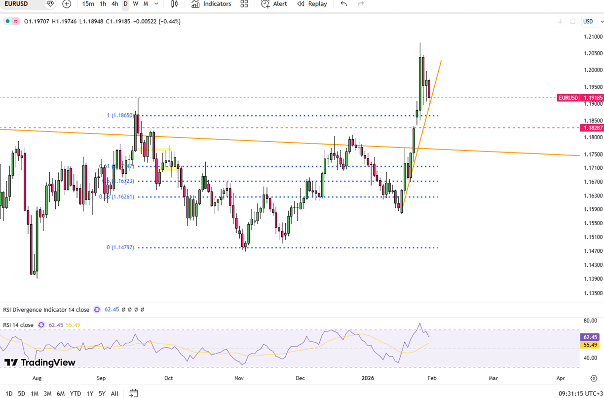 انخفض زوج اليورو/الدولار الأمريكي نحو 1.1900 مع تراجع الإشارات الفنية، في حين تراجع الين لكنه ظل في طريقه لتحقيق أول مكاسب شهرية له منذ أغسطس. وتراجع الذهب والفضة من مستويات قياسية بسبب عمليات جني الأرباح، على الرغم من أن كلاهما من المتوقع أن يسجل مكاسب شهرية تاريخية. كما انخفض الجنيه الإسترليني مع تلاشي مخاطر إغلاق الحكومة الأمريكية وتطلع الأسواق إلى اجتماع بنك إنجلترا المركزي الأسبوع المقبل.
