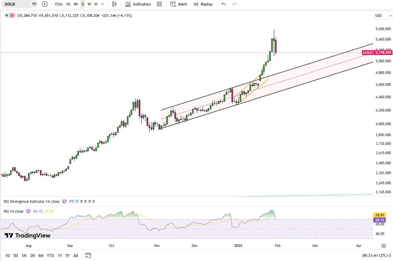 انخفض سعر الذهب إلى حوالي 5200 دولار للأونصة يوم الجمعة، حيث قام المستثمرون بتحقيق أرباحهم بعد سلسلة من الارتفاعات القياسية. على الرغم من هذا التراجع، أنهى الذهب شهر يناير بارتفاع تجاوز 20٪، وهو أفضل أداء شهري له منذ الثمانينيات. يستمر الارتفاع الأوسع نطاقاً مدفوعاً بضعف الدولار وزيادة التوترات الجيوسياسية. وفي الآونة الأخيرة، وقع الرئيس ترامب أمرًا تنفيذيًا يستهدف الدول التي تزود كوبا بالنفط، وهي خطوة تزيد من الضغط الاقتصادي على المكسيك وتزيد من عدم اليقين في التجارة العالمية.