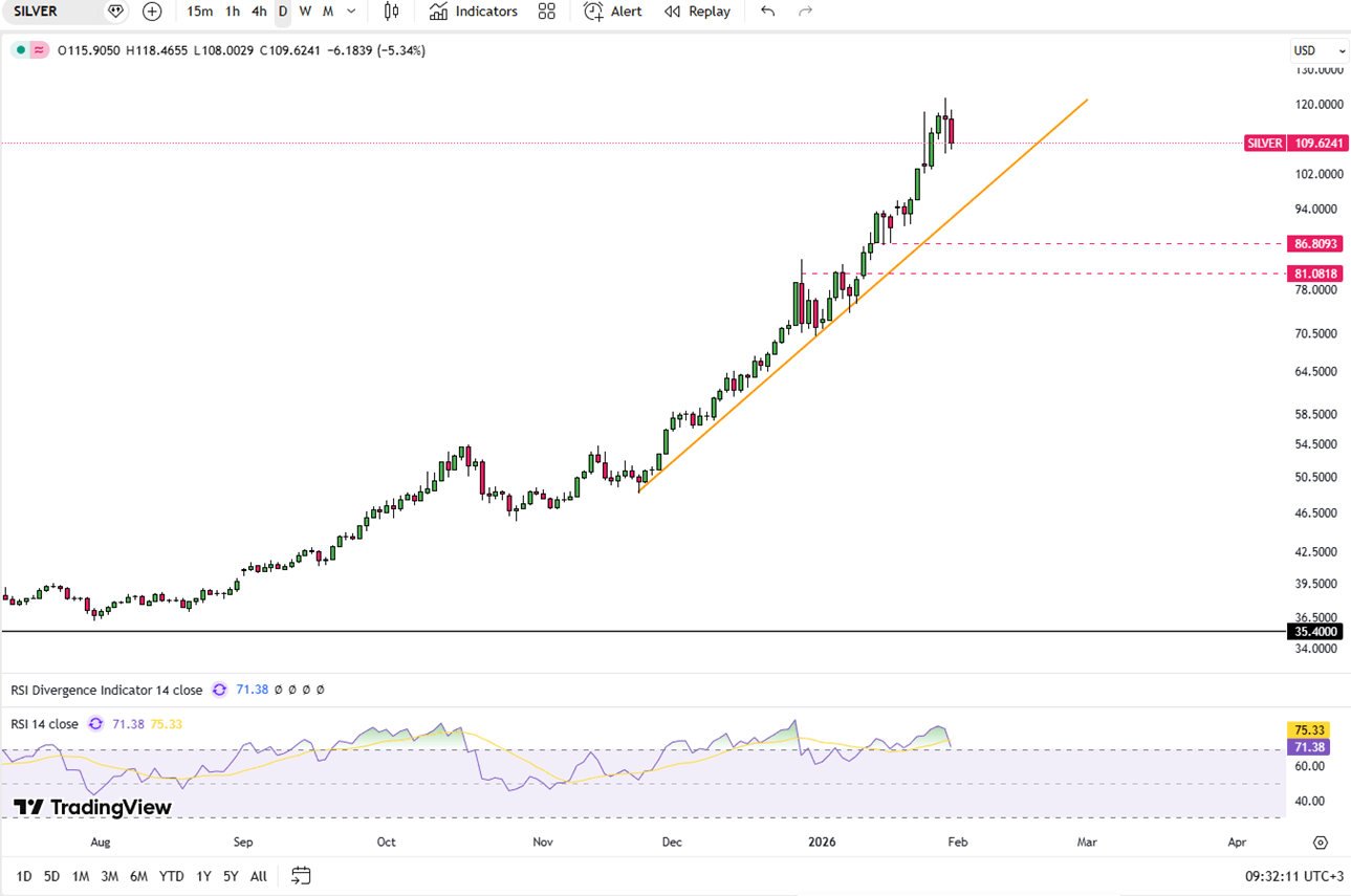 انخفضت الفضة بنحو 4٪ لتصل إلى 110 دولارات للأونصة يوم الجمعة، حيث قام المستثمرون بتحقيق أرباحهم بعد الارتفاع التاريخي الذي شهدته مؤخرًا. وأدى الانتعاش الطفيف في الدولار إلى زيادة الضغط على المعدن. على الرغم من انخفاض اليوم، لا يزال الفضة مرتفعًا بأكثر من 50٪ لشهر يناير، مسجلاً أفضل مكاسب شهرية له على الإطلاق وممددًا سلسلة مكاسبه إلى تسعة أشهر.