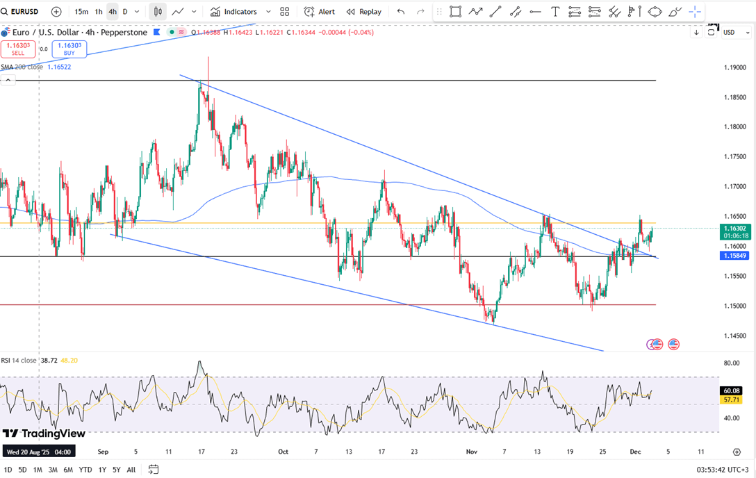 تداول زوج اليورو/الدولار الأمريكي بالقرب من مستوى 1.1635، حيث حافظت التضخم القوي في منطقة اليورو والإشارات الثابتة من البنك المركزي الأوروبي على دعم اليورو. واستقر زوج الجنيه الإسترليني/الدولار الأمريكي حول مستوى 1.3230، مع ترقب الأسواق لقرارات السياسة النقدية في ديسمبر من كل من بنك الاحتياطي الفيدرالي وبنك إنجلترا.