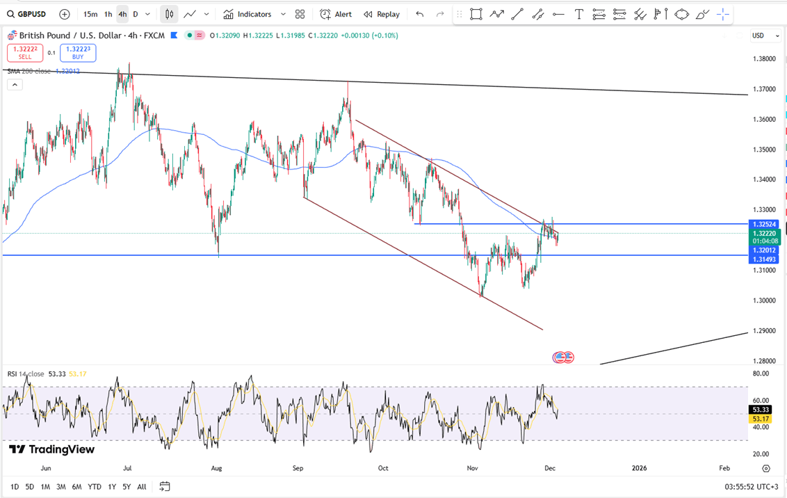 تداول زوج الجنيه الإسترليني/الدولار الأمريكي حول مستوى 1.3230، حيث ترقب الأسواق إشارات أوضح من كل من بنك الاحتياطي الفيدرالي وبنك إنجلترا قبل قرارات السياسة النقدية في ديسمبر. من المتوقع على نطاق واسع أن يقوم بنك إنجلترا بتخفيض آخر لأسعار الفائدة، حيث لم تشهد الأوضاع في المملكة المتحدة تحسناً يذكر منذ الاجتماع الأخير، الذي صوت فيه أربعة أعضاء بالفعل لصالح خفض ربع نقطة مئوية في تصويت ضيق بنتيجة 5-4.
