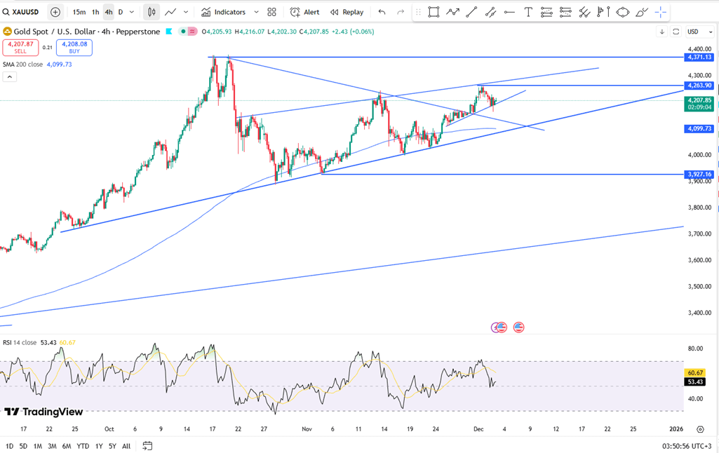 يقترب مستوى الدعم من 4190 دولارًا، بينما يقع مستوى المقاومة عند حوالي 4275 دولارًا.