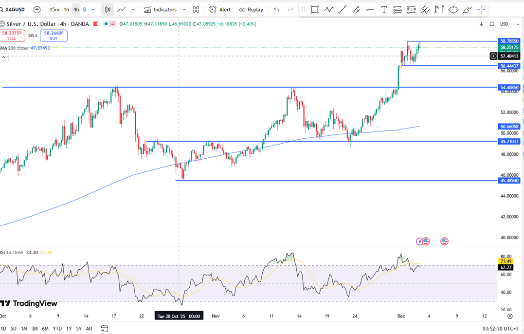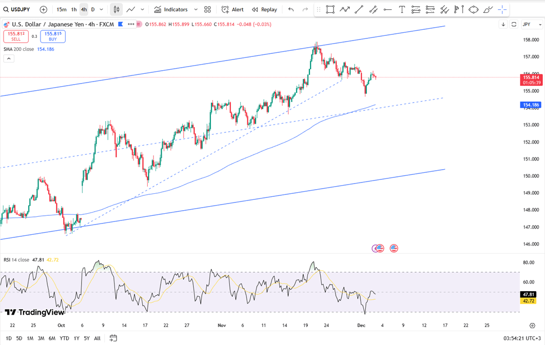 تحرك الذهب نحو 4220 دولارًا مع احتمالية تقارب 90٪ لخفض سعر الفائدة من قبل بنك الاحتياطي الفيدرالي الأسبوع المقبل، بينما واصلت الفضة ارتفاعها القوي لعام 2025 لتتجاوز 58.70 دولارًا. ارتفع الين نحو 155.5، مستعيدًا خسائره السابقة مع ارتفاع توقعات البيانات الأمريكية بتخفيف أكبر من قبل بنك الاحتياطي الفيدرالي، حتى مع استمرار اليابان في مناقشة احتمال رفع سعر الفائدة من قبل بنك اليابان المركزي هذا الشهر.