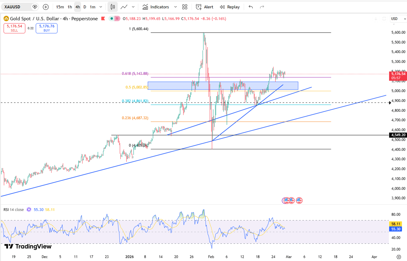 ارتفع سعر الذهب يوم الجمعة إلى 5190 دولارًا للأونصة، مسجلاً ارتفاعه الأسبوعي الرابع على التوالي. يتعامل المستثمرون مع خلفية معقدة من التغيرات التجارية الأمريكية والتوترات الجيوسياسية. في حين أن التعريفة الجمركية العالمية الجديدة بنسبة 10٪ سارية المفعول الآن، فإن احتمال رفعها إلى 15٪ وتوقف المحادثات النووية بين الولايات المتحدة وإيران في جنيف لا يزالان يدفعان الطلب على الملاذات الآمنة.