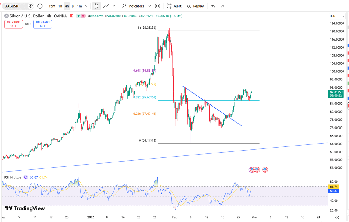ارتفعت الفضة بنحو 2٪ لتصل إلى 90 دولارًا للأونصة يوم الجمعة، في طريقها لتحقيق ارتفاع أسبوعي ثانٍ على التوالي. تستمر المخاطر الجيوسياسية المتزايدة والتغيرات في السياسة التجارية الأمريكية في تغذية الطلب على الملاذات الآمنة، حيث يتعامل المستثمرون مع تداعيات الحكم الأخير للمحكمة العليا ضد التعريفات الجمركية المتبادلة الواسعة النطاق.
