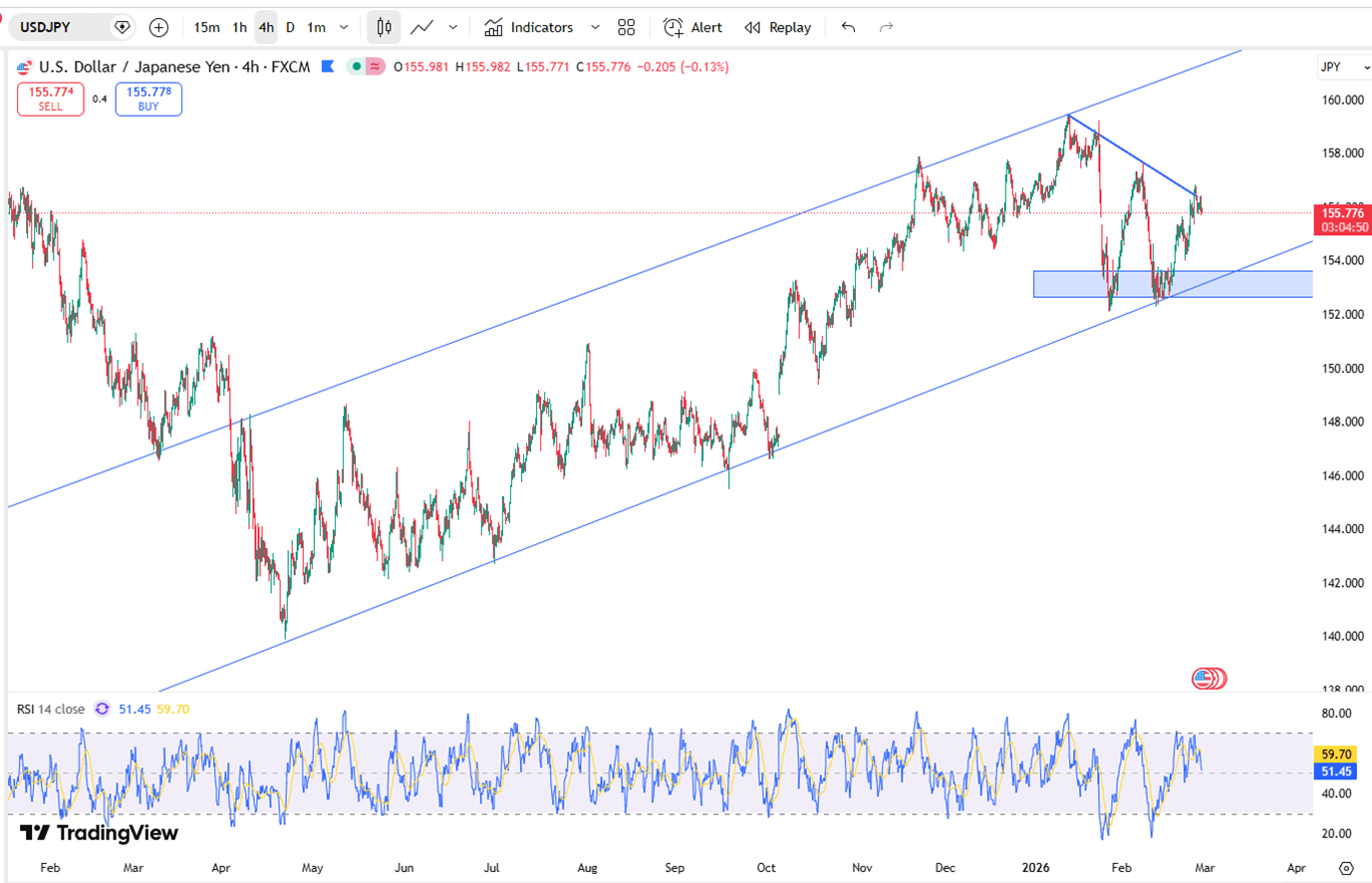 من الناحية الفنية، تقع المقاومة بالقرب من 156.70، بينما يظل الدعم قوياً عند 153.50.