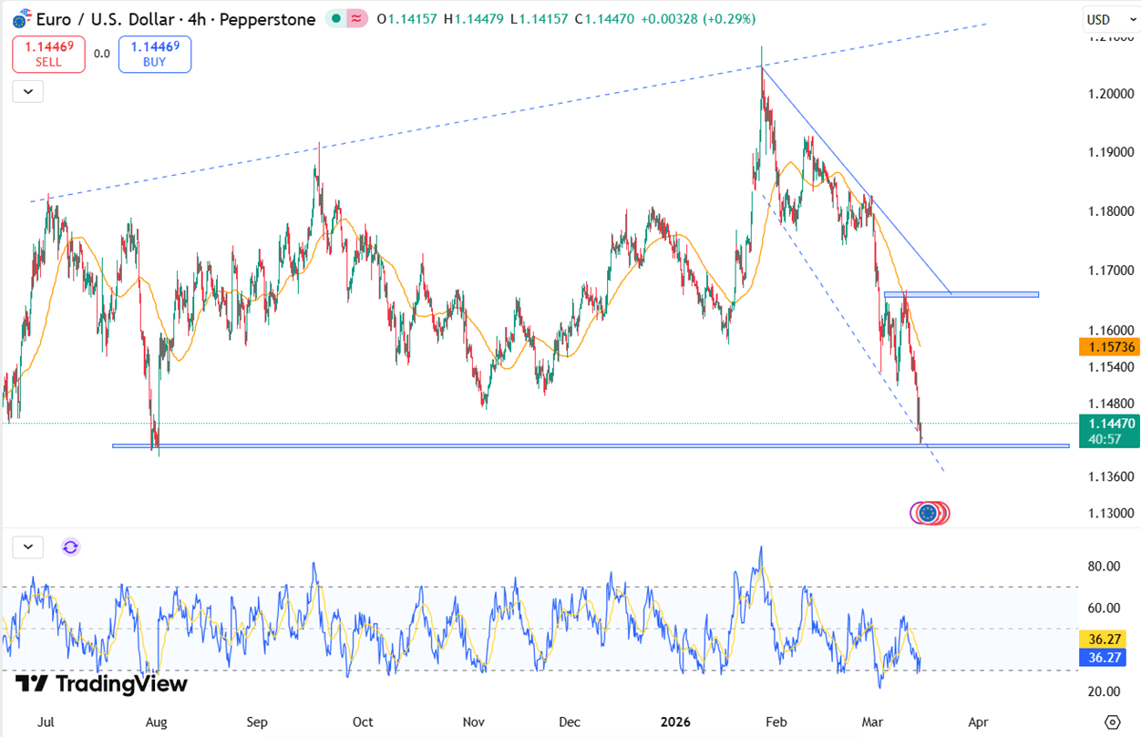 لا يزال زوج اليورو/الدولار الأمريكي يتعرض لضغوط بيعية شديدة بالقرب من مستوى 1.1440، حيث يختبر مستوى 1.1430 سعياً وراء تسجيل أدنى مستوى سنوي جديد. ويستمر ارتفاع الدولار الأمريكي في جذب المستثمرين في ظل استمرار التوترات في الشرق الأوسط، مما يخلق جواً من الحذر في الأسواق.
