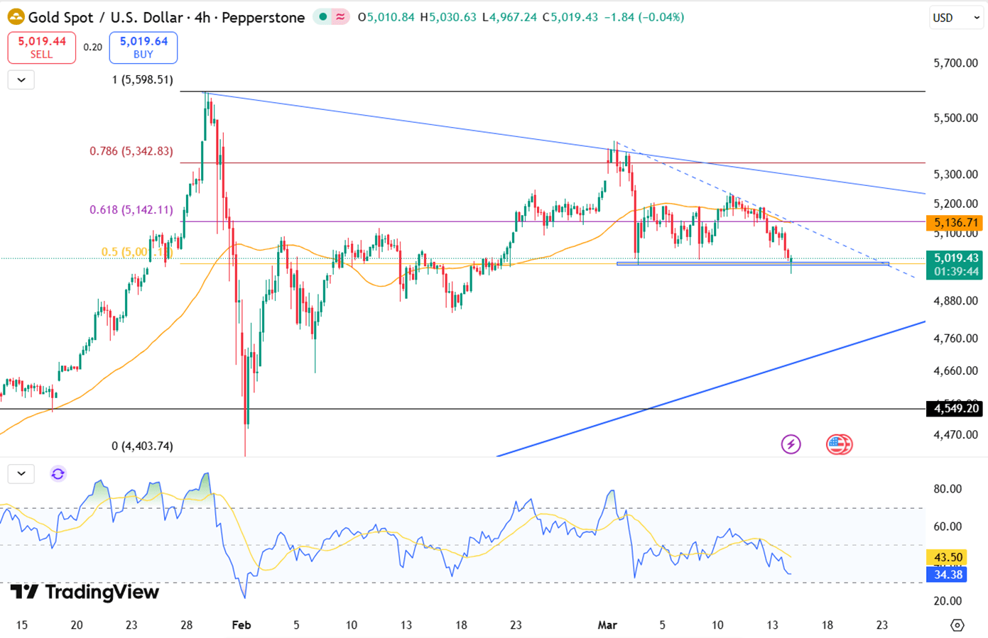 تداول الذهب بالقرب من مستوى 5000 دولار للأونصة، بعد أسبوعين من التراجع. وارتفعت تقلبات السوق بشكل حاد عقب الضربة الأمريكية التي استهدفت منشأة نفطية في جزيرة خارج الإيرانية خلال عطلة نهاية الأسبوع، مما أدى إلى شن هجمات إيرانية انتقامية على إسرائيل ومراكز الطاقة الإقليمية. مع دخول الصراع أسبوعه الثالث، أدى تفاقم التضخم وارتفاع أسعار النفط إلى تراجع الآمال في قيام البنك المركزي بخفض أسعار الفائدة. وتستمر هذه الضغوط التضخمية المستمرة وتوقعات بقاء أسعار الفائدة مرتفعة لفترة أطول في تشكيل تحديات أمام جاذبية الذهب كأصل غير مدر للدخل وسط حالة عدم الاستقرار الجيوسياسي المستمرة.