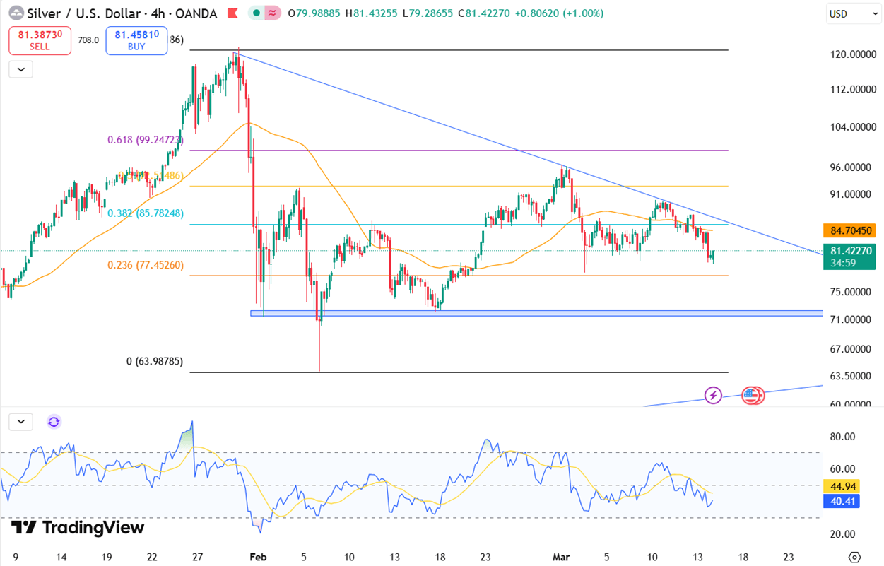 انخفض سعر الفضة إلى حوالي 80 دولارًا للأونصة، مسجلةً خسائرها لليوم الرابع على التوالي مع دخول الصراع الإيراني أسبوعه الثالث. لا يزال عدم الاستقرار في الأسواق شديدًا في أعقاب الضربة الأمريكية التي استهدفت مركز النفط في جزيرة خارج، والتحذيرات من شن المزيد من الضربات في حال قامت طهران بإغلاق مضيق هرمز. وفي ظل تقلبات أسعار النفط، يقيّم المستثمرون تأثير تشكيل تحالف دولي محتمل بقيادة الولايات المتحدة يهدف إلى مرافقة السفن التجارية عبر الممر المائي وتأمين خطوط إمدادات الطاقة العالمية.
