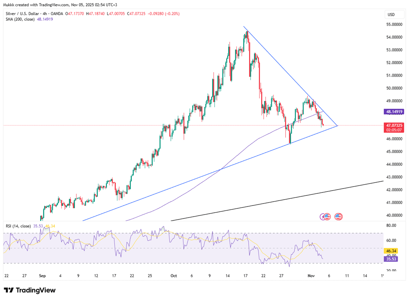 استعاد الفضة جزءًا من خسائره في الجلسة السابقة خلال تداولات الأربعاء في آسيا، مدعومًا بتجدد الطلب على الملاذات الآمنة. وينتظر المستثمرون الآن صدور بيانات أمريكية مهمة في وقت لاحق اليوم لمعرفة الاتجاه المستقبلي. وعلى الرغم من أن بنك الاحتياطي الفيدرالي قد خفض سعر الفائدة بمقدار 25 نقطة أساس كما كان متوقعاً، إلا أن رئيس البنك باول أشار إلى أن خفضاً آخر في ديسمبر ليس مضموناً، مما حد من الزخم الصعودي الأوسع نطاقاً.