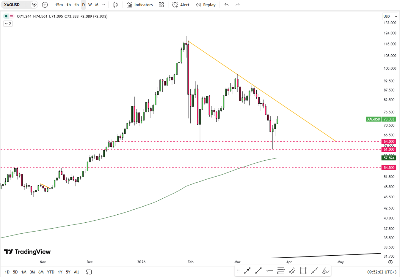 ارتفعت الفضة بنسبة 4% لتصل إلى حوالي 74 دولارًا للأونصة يوم الأربعاء، مسجلةً بذلك ارتفاعًا للجلسة الثالثة على التوالي مع تزايد التفاؤل بشأن التوصل إلى حل للأزمة في الشرق الأوسط. وقد ساهمت التقارير المتعلقة بمقترح أمريكي من 15 نقطة وخطة لوقف إطلاق النار لمدة شهر مع إيران في تحسين المعنويات، على الرغم من نشر قوات إضافية. وكانت الفضة قد انخفضت سابقًا بنسبة 37% عن أعلى مستوى لها في مارس بسبب مخاوف التضخم المدفوعة بأسعار الطاقة وإشارات محافظ الاحتياطي الفيدرالي مايكل بار إلى احتمال بقاء أسعار الفائدة مرتفعة.
