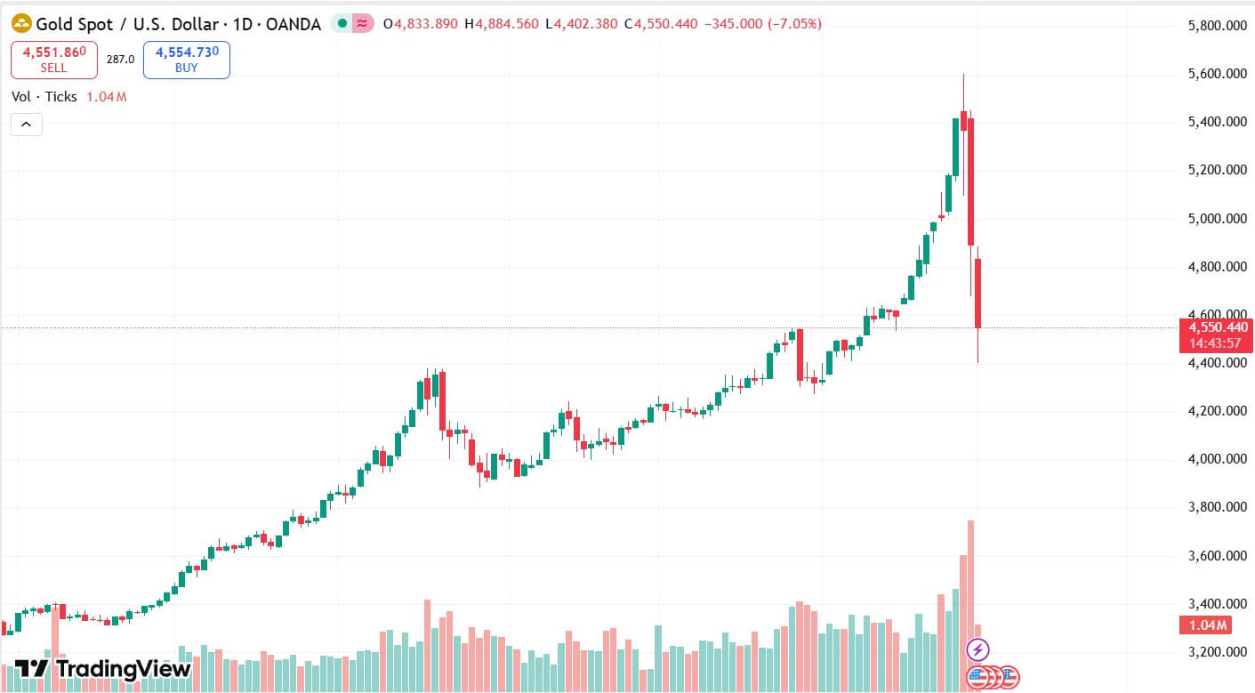 تواجه المعادن الثمينة ضغوطًا شديدة مع تحول الأسواق إلى وجهة نظر أقل تساهلاً بشأن ترشيح كيفن وارش لرئاسة مجلس الاحتياطي الفيدرالي، مما أدى إلى ارتفاع الدولار. وتفاقمت موجة البيع هذه بسبب قيام مجموعة CME برفع متطلبات الهامش، مما أدى إلى تصفية المراكز المرفوعة بالرافعة المالية وتسريع تراجع الذهب والفضة.