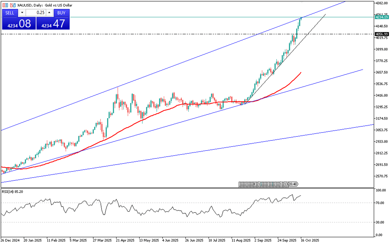 ارتفع سعر الذهب يوم الخميس إلى ما يزيد عن 4230 دولارًا للأونصة، مسجلاً رقمًا قياسيًا جديدًا مع تزايد الطلب على الملاذات الآمنة وسط توقعات بسياسة نقدية متساهلة من بنك الاحتياطي الفيدرالي. وأثارت تصريحات رئيس البنك الاحتياطي الفيدرالي جيروم باول بشأن ضعف سوق العمل التوقعات بخفض أسعار الفائدة بمقدار 25 نقطة أساس في كل من أكتوبر وديسمبر، مما أدى إلى إضعاف الدولار وارتفاع الذهب. كما أدى تصاعد التوترات بين الولايات المتحدة والصين بشأن قيود تصدير المعادن النادرة إلى زيادة الطلب على الأصول الآمنة.