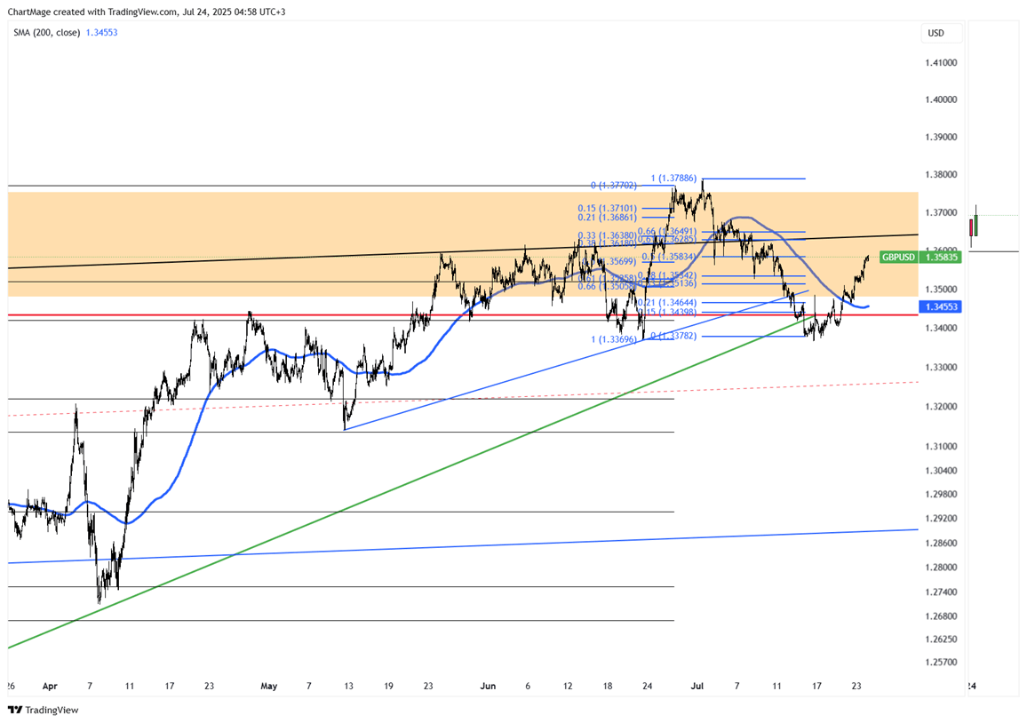 واصل الجنيه الإسترليني ارتفاعه للجلسة الثالثة على التوالي، حيث ارتفع نحو 1.3600 يوم الأربعاء مع تراجع الدولار في جميع المجالات. وتتفاعل الأسواق مع المحادثات التجارية التي جرت في اللحظة الأخيرة، بما في ذلك اتفاق مبدئي بين الولايات المتحدة واليابان يتضمن تعريفة جمركية متبادلة بنسبة 15%.
