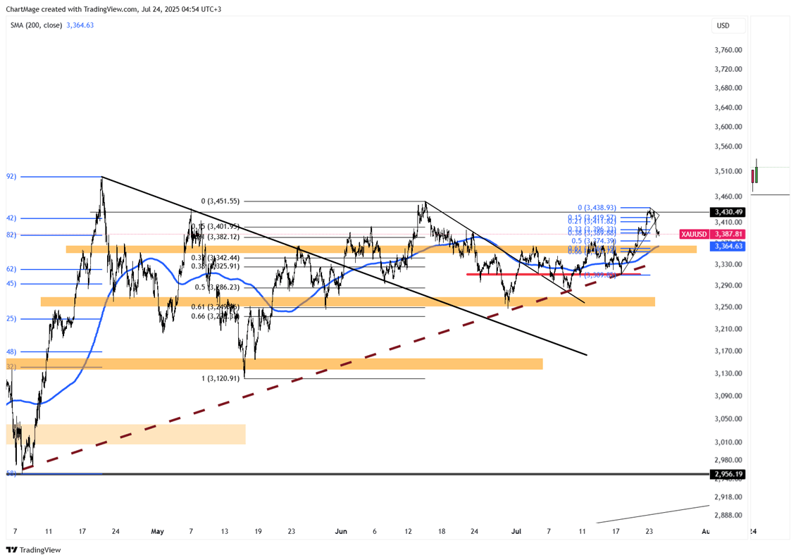 تم تداول الذهب أقل بقليل من 3,390 دولارًا للأونصة يوم الخميس، مواصلاً انخفاضه بأكثر من 1% عن الجلسة السابقة. وقد أدى التقدم المحرز في الصفقات التجارية، بما في ذلك اتفاق محتمل بين الولايات المتحدة والاتحاد الأوروبي مع فرض رسوم جمركية بنسبة 15%، إلى تقليل الطلب على أصول الملاذ الآمن. ويحاكي الاتفاق شروط اتفاق سابق مع اليابان، وقد يشمل تعريفات جمركية على السيارات. وعلى الرغم من المعنويات الحذرة بشأن المفاوضات الجارية مع كوريا الجنوبية والهند، والمحادثات الأمريكية الصينية القادمة، تحول تركيز المستثمرين نحو اجتماع الاحتياطي الفدرالي، مع عدم توقع حدوث تغييرات فورية في أسعار الفائدة، ولكن من المتوقع إجراء تخفيضات محتملة في أكتوبر.