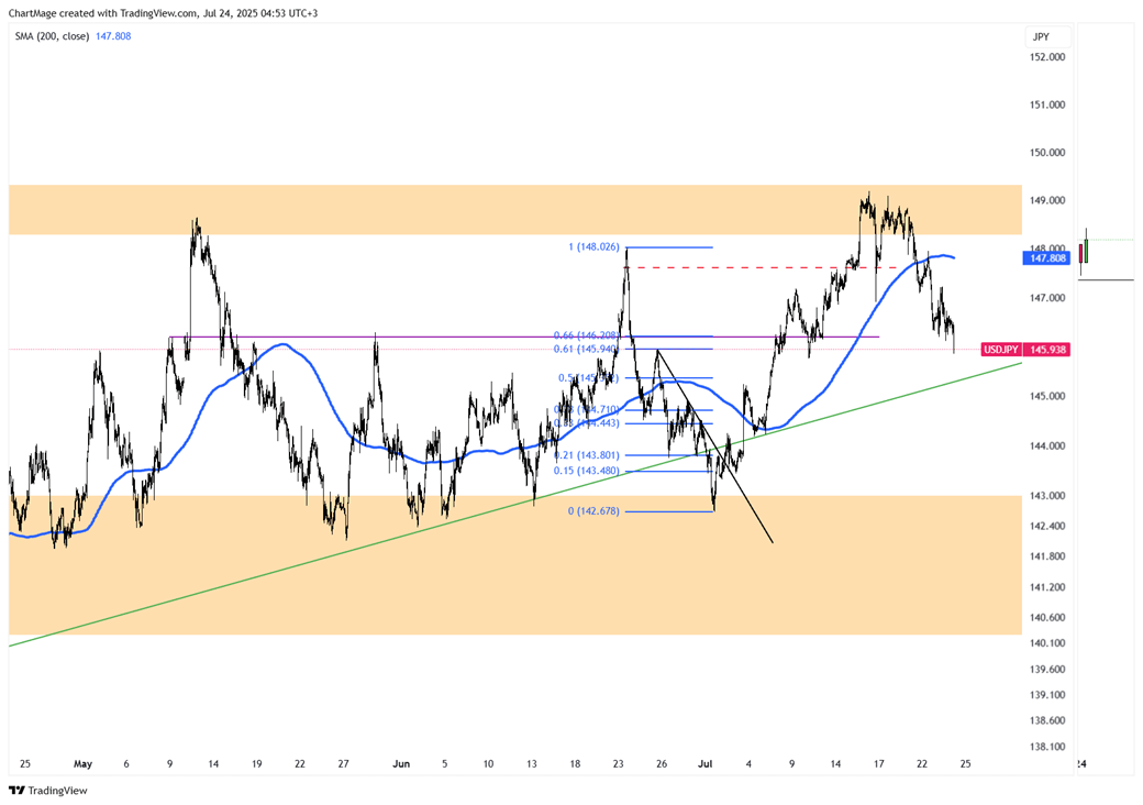 ارتفع الين الياباني للجلسة الرابعة على التوالي، ليصل إلى أعلى مستوياته في حوالي ثلاثة أسابيع حول 146.5، مدعومًا باتفاق تجاري جديد بين الولايات المتحدة واليابان خفف من حالة عدم اليقين الاقتصادي. أثار الاتفاق تكهنات بأن بنك اليابان قد يفكر في تشديد السياسة النقدية في وقت لاحق من هذا العام. وفي الوقت نفسه، ظل الدولار ضعيفًا بالقرب من أدنى مستوياته في أسبوعين ونصف الأسبوع. ومع ذلك، فإن بيانات مؤشر مديري المشتريات التصنيعي الياباني الضعيفة وعدم الاستقرار السياسي المستمر، بما في ذلك شائعات استقالة رئيس الوزراء إيشيبا، قد يحد من قوة الين. يترقب المتداولون بيانات مؤشر مديري المشتريات الأمريكية السريعة للحصول على إشارات على المدى القريب.