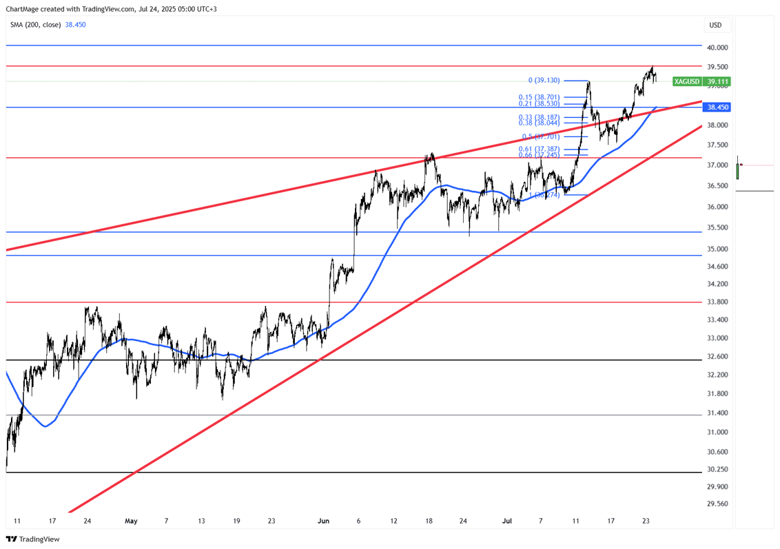 ظلت الفضة ثابتة فوق مستوى 39 دولارًا للأونصة، لتحوم بالقرب من أعلى مستوى لها منذ عام 2011. واستمر تراجع الدولار وانخفاض عوائد سندات الخزانة في دعم الطلب على المعادن. كما وجد السوق دعمًا أيضًا في العناوين التجارية: فقد فرض اتفاق ترامب الجديد مع اليابان تعريفة جمركية بنسبة 15%، بينما تستعد الصين والولايات المتحدة للاجتماع الأسبوع المقبل في ستوكهولم.