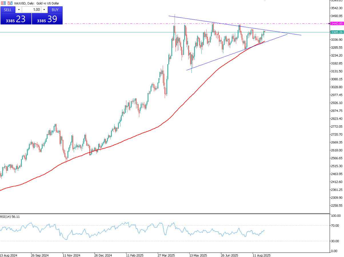 تقف المقاومة عند 3393 دولارًا، مع دعم عند 3351 دولارًا.