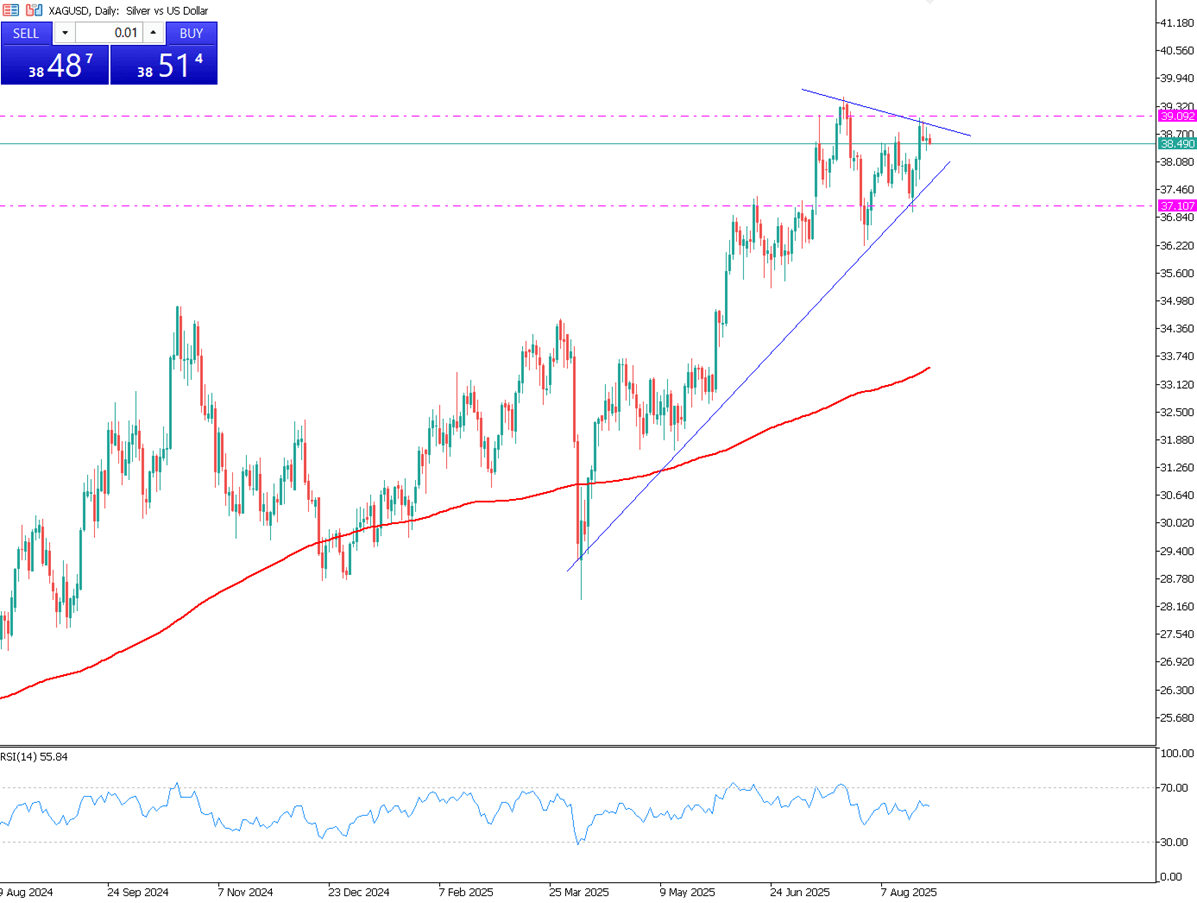 تقع المقاومة عند 39.00 دولارًا، مع دعم عند 38.25 دولارًا.