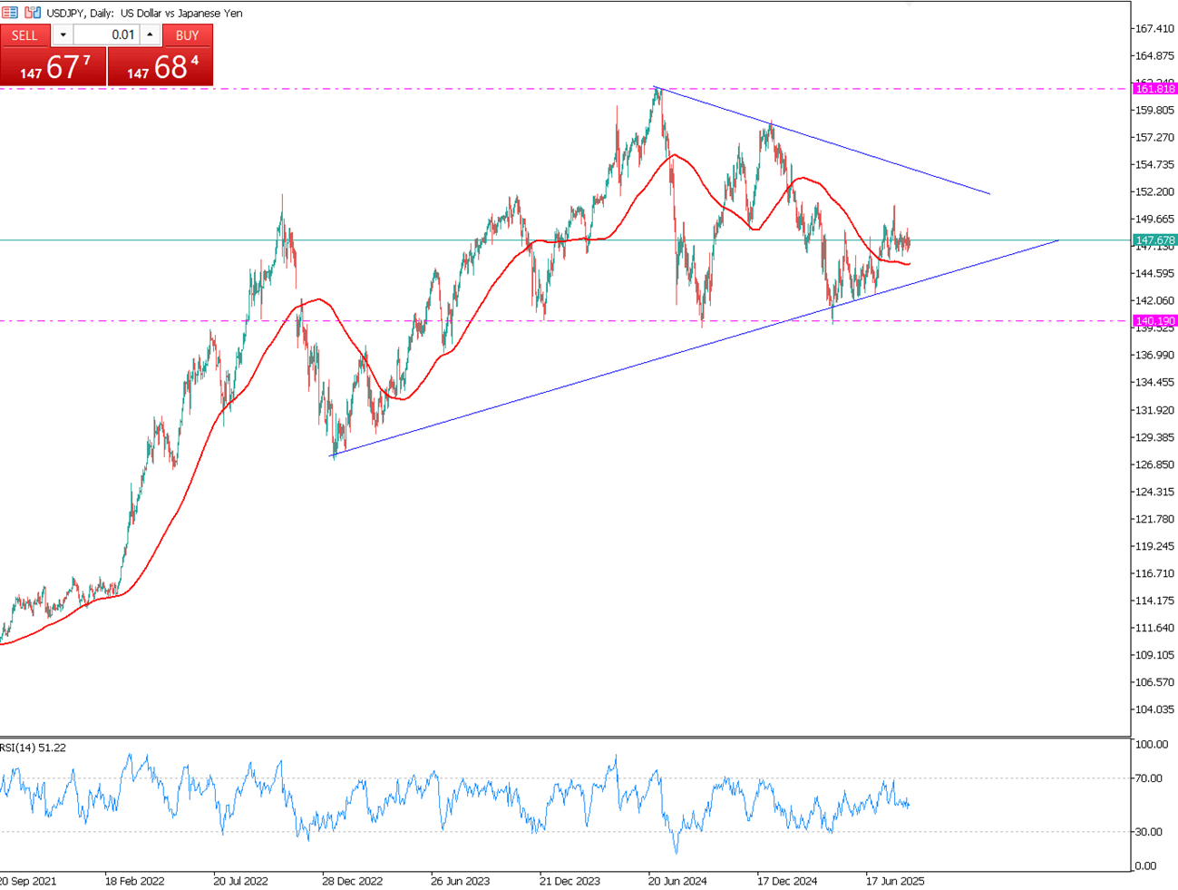 تقع المقاومة عند 148.80، مع دعم عند 146.50.