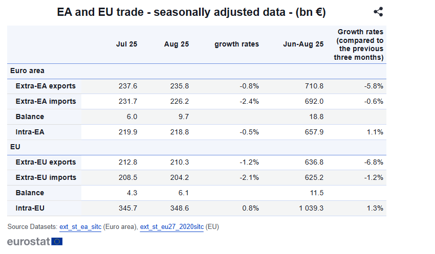 انخفضت صادرات منطقة اليورو الإجمالية بنسبة 4.7% على أساس سنوي إلى 205.9 مليارات يورو، بقيادة تراجعات حادة في قطاع الكيماويات (-9.6%) والآلات والمركبات (-3.9%). وكان الضعف واسع النطاق في معظم الأسواق الرئيسية، حيث تراجعت الشحنات إلى الصين (-12.8%)، اليابان (-24.9%)، كوريا الجنوبية (-14.2%)، والهند (-9.8%).