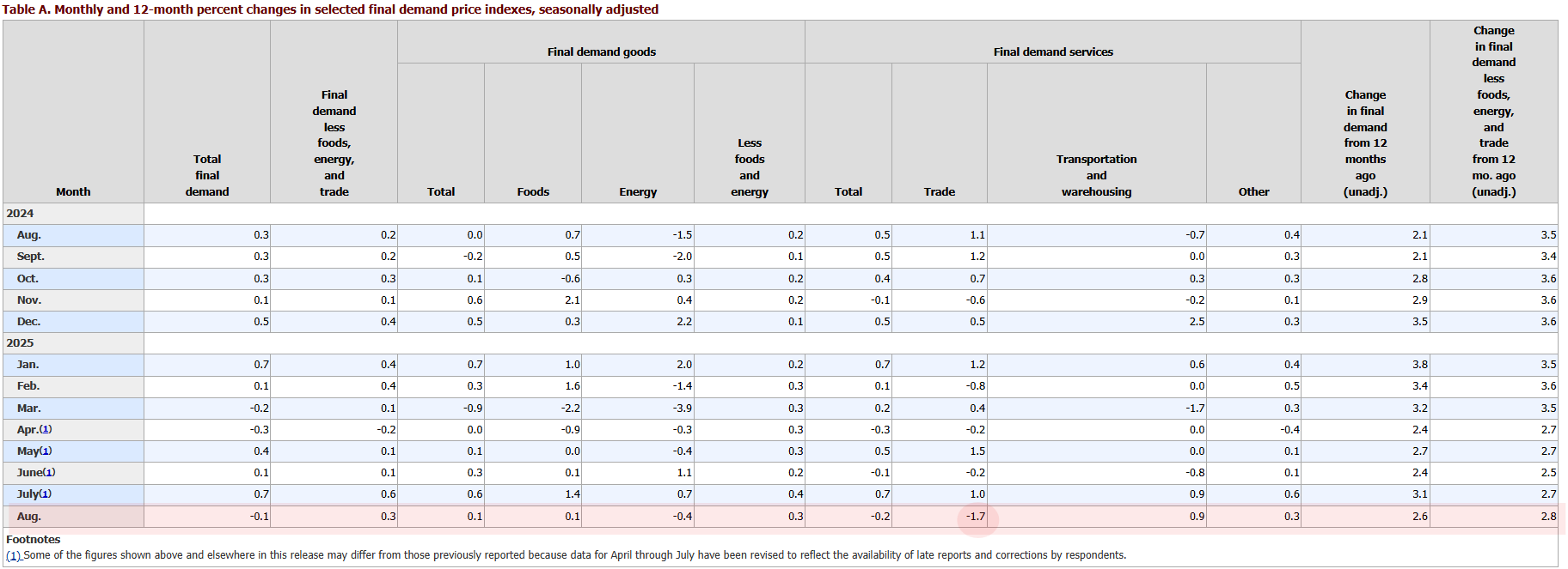 انخفض مؤشر أسعار المنتجين (PPI) للطلب النهائي بنسبة 0.1٪ في أغسطس، وفقًا لبيانات مكتب إحصاءات العمل.