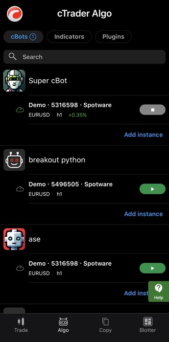 4- Add a cBot Instance: Open cTrader, switch to the Algo tab, and create a new cBot instance. At this stage, you define key parameters such as the trading instrument, timeframe, position sizing, and risk settings.