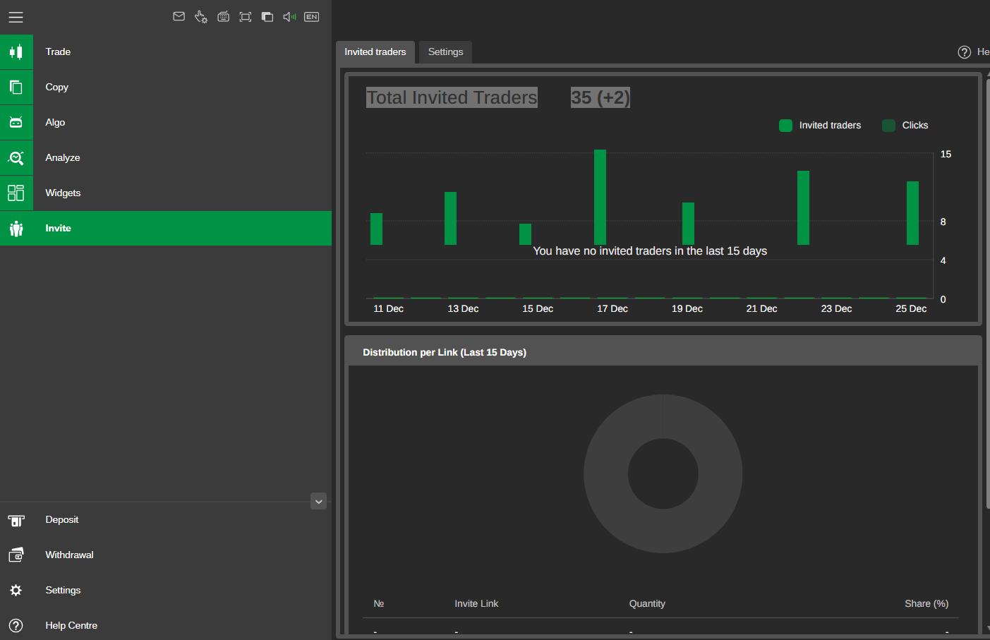 cTrader Invite is built directly into the trading platform, so referrals, QR codes, and tracking work natively without extra plugins, landing pages, or third-party systems.