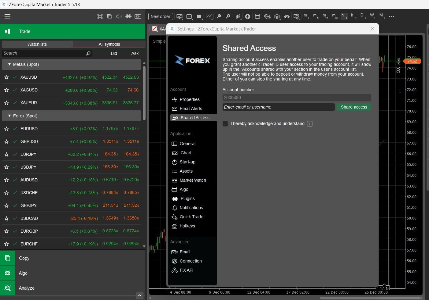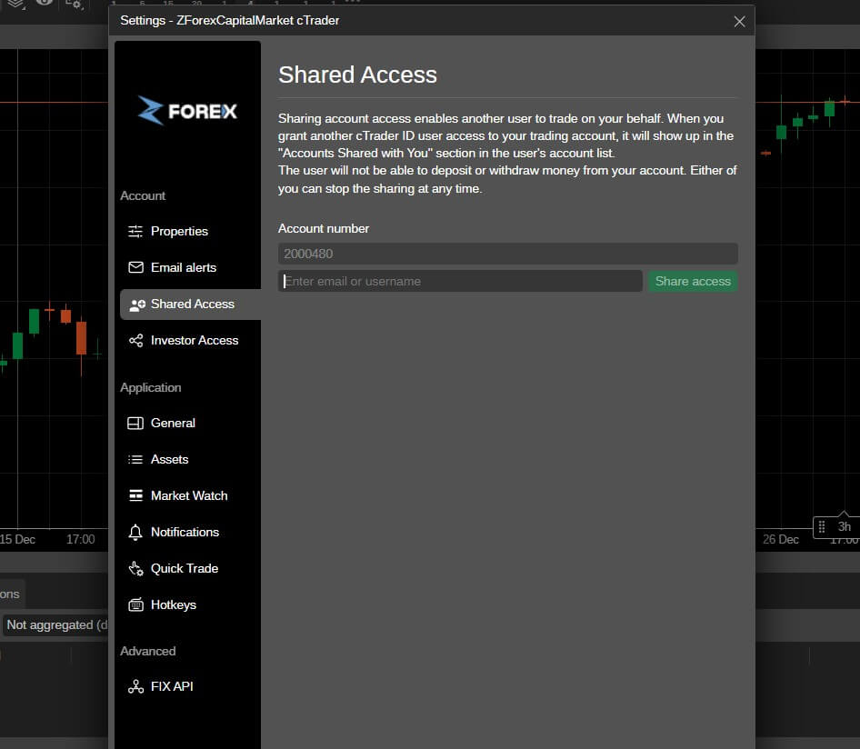 Shared Access in cTrader lets you allow another person to trade on your account without giving them your login details. The invited user can place, manage, and close trades, but they do not become the account owner, and they cannot deposit, withdraw, or take control of your funds. You always stay in charge, and you can remove access whenever you want.