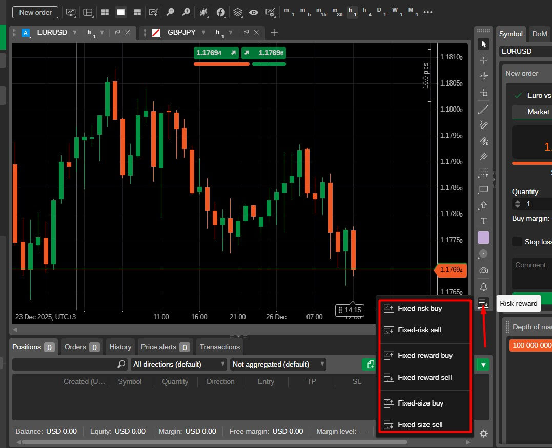 Open a chart and place the Risk-Reward object. Set your entry level, then drag the stop-loss to where the trade idea would be invalid and place the take-profit where you think price has room to reach.