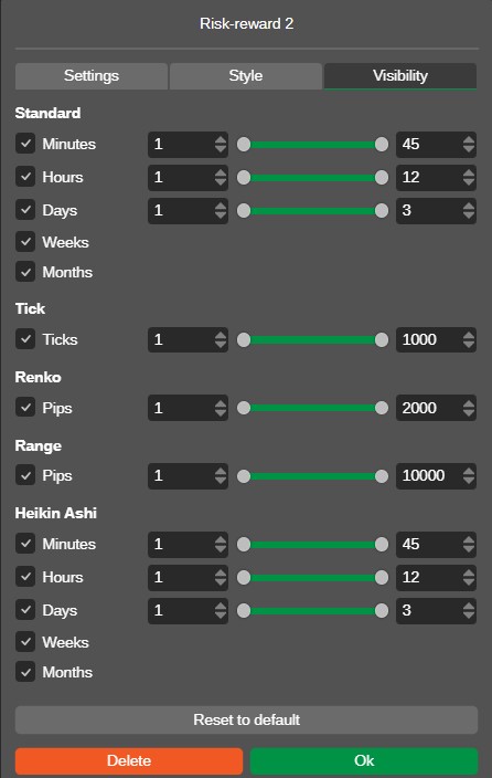 On the other hand, the Visibility tab controls which chart types and timeframes your Risk-Reward object appears on. You can choose if the RR plan should be shown on 1-minute charts, 1-hour charts, daily charts, Renko charts, tick charts, and more.
