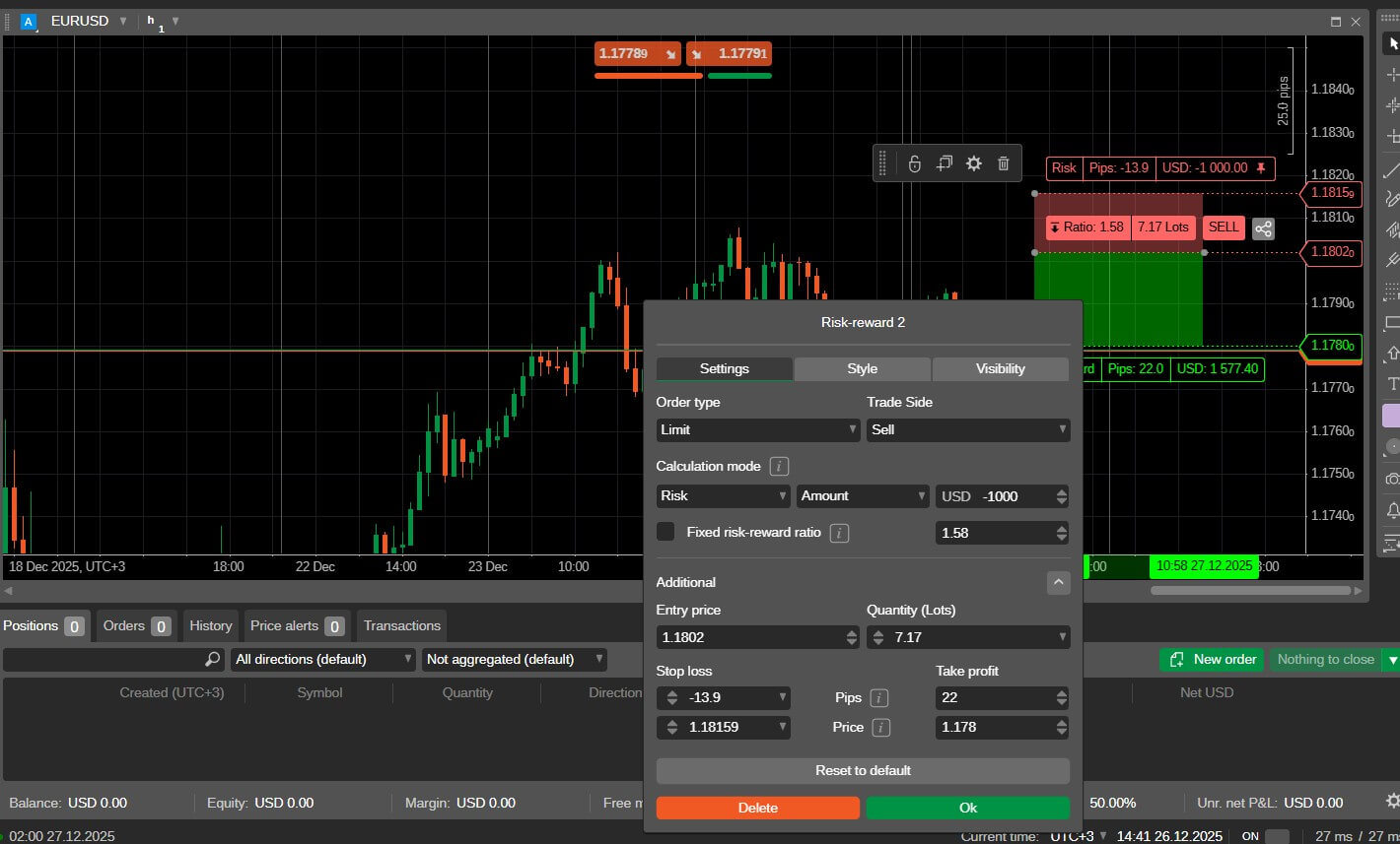 As you move these levels, cTrader updates the risk–reward ratio and can even calculate the position size based on the risk or reward you choose.