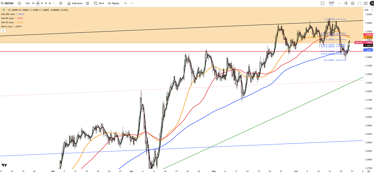 La resistencia se sitúa en 1,3500, mientras que el soporte se mantiene en 1,3415.